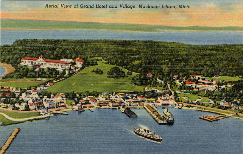 Bird's-eye view of the Grand Hotel, Mackinac Island, Michigan. Printed on front: "Aerial view of the Grand Hotel and village, Mackinac Island, Mich." Printed on back: "Benjamin's Photo Art Service, Mackinac Island, Mich. Genuine Curteich-Chicago 'C.T. Art-Colortone' post card (reg. U.S. Pat. Off.)"