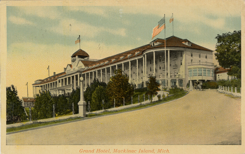 View of the Grand Hotel, Mackinac Island, Michigan. Printed on front: "Grand Hotel, Mackinac Island, Mich." Printed on back: "35011. Pub. by Rosenfield & Goodman, Chicago, Ill." Handwritten on back: "I have been up here the past two weeks and strange to say we have had most pleasant weather. M.E. Murphy." Card is postmarked August 29, 1915.