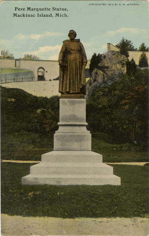 View of statue of Pere Marquette on Mackinac Island, Michigan. Printed on front: "Pere Marquette statue, Mackinac Island, Mich. Copyrighted 1910 by G.H. Wickman." Printed on back: "G.H. Wickman, publisher. Made in U.S.A." Handwritten on back: "I am up here on Mackinac Island for a week's stay after a very happy three week visit in Cleveland and a most enjoyable ride over the Lakes. There is very beautiful country about these regions. Mackinac Island or 'The Fairy Isle' as it is called is lovely before words. This statue of Pere Marquette is in the beautiful gardens in front of the old fort. Too bad this picture of it is so badly reproduced for the statue itself is very fine. Sincerely, Georg. H. [undecipherable]." Card is postmarked August 31, 1912.