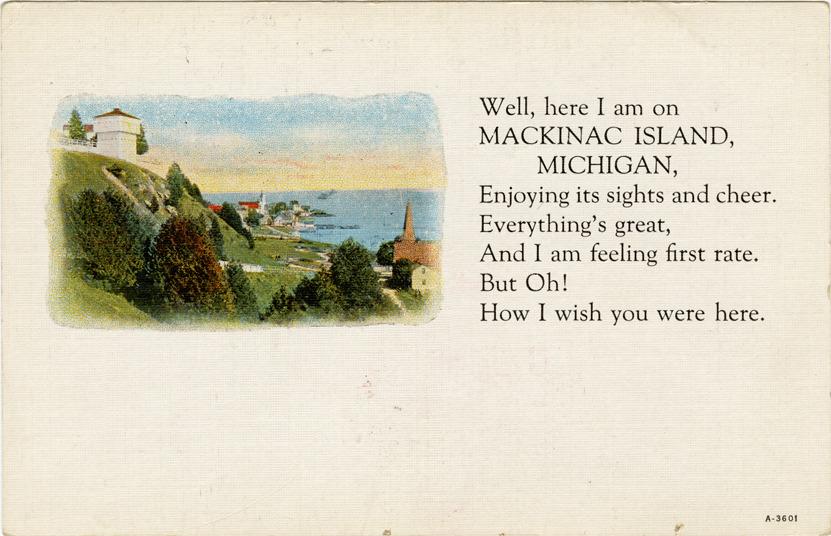 View of a souvenir postcard from Mackinac Island, Michigan, showing fort and buildings on shoreline. Printed on front: "Well, here I am on Mackinac Island, Michigan. Enjoying its sights and cheer. Everything's great, and I am feeling first rate. But, oh! How I wish you were here." Printed on back: "G.H. Wickman, Mackinac Island, Mich. Made in U.S.A. C.T. American Art Colored. CT Co., Chicago."