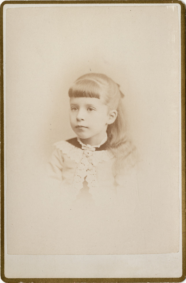 Portrait of Gracie Brainerd Krum as a young girl. Printed on back: "W.L. Estabrooke, 2308 Third Avenue, N.Y. Cor. 125th St." Handwritten on back: "Krum, Gracie B."