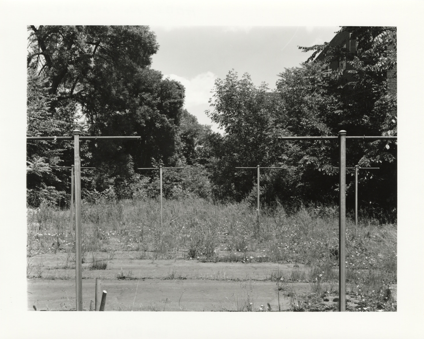 View of clothesline supports in drying court at Parkside Homes. Apartment buildings are partially behind trees. Located at Connor and East Warren Avenues, Parkside Homes was the first federally-funded low-income public housing project built in Detroit and Michigan. Finding aid: "View southeast, drying court between apartment buildings 402 and 403, Parkside Homes."