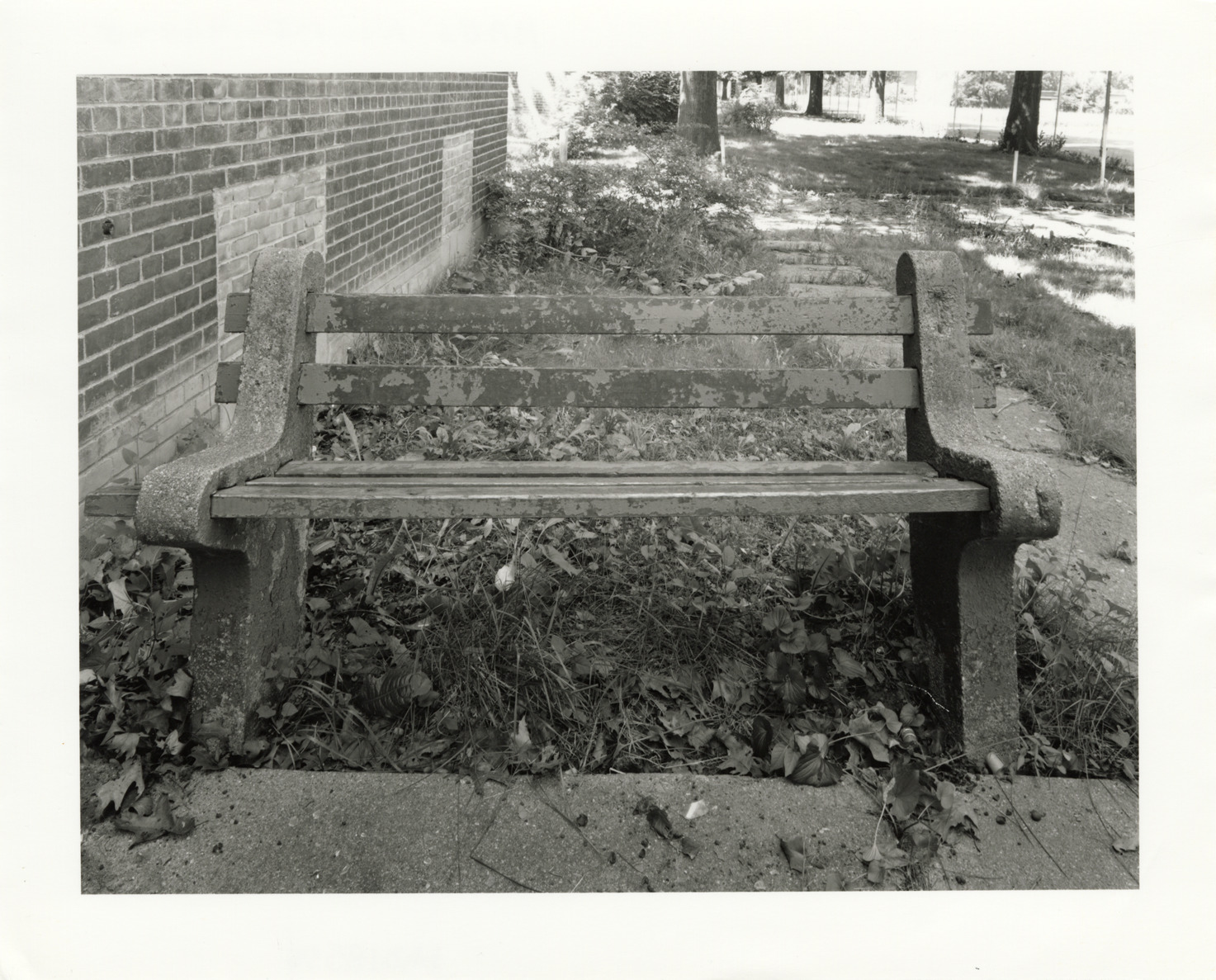 View bench on the north side of apartment building 402 at Parkside Homes. Located at Connor and East Warren Avenues, Parkside Homes was the first federally-funded low-income public housing project built in Detroit and Michigan. Finding aid: "View west, bench on north side of apartment building 402, Parkside Homes."