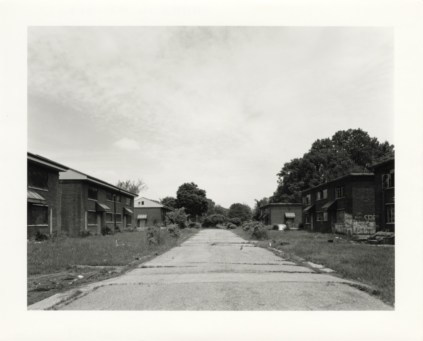 View of residential buildings 305, 306, 314, 304, 307 and 313 at Parkside Addition. Located at Connor and East Warren Avenues, Parkside Homes was the first federally-funded low-income public housing project built in Detroit and Michigan. Finding aid: "Long view north, buildings 305, 306, 314 on right and buildings 304, 307, 313 on left, Parkside Addition."