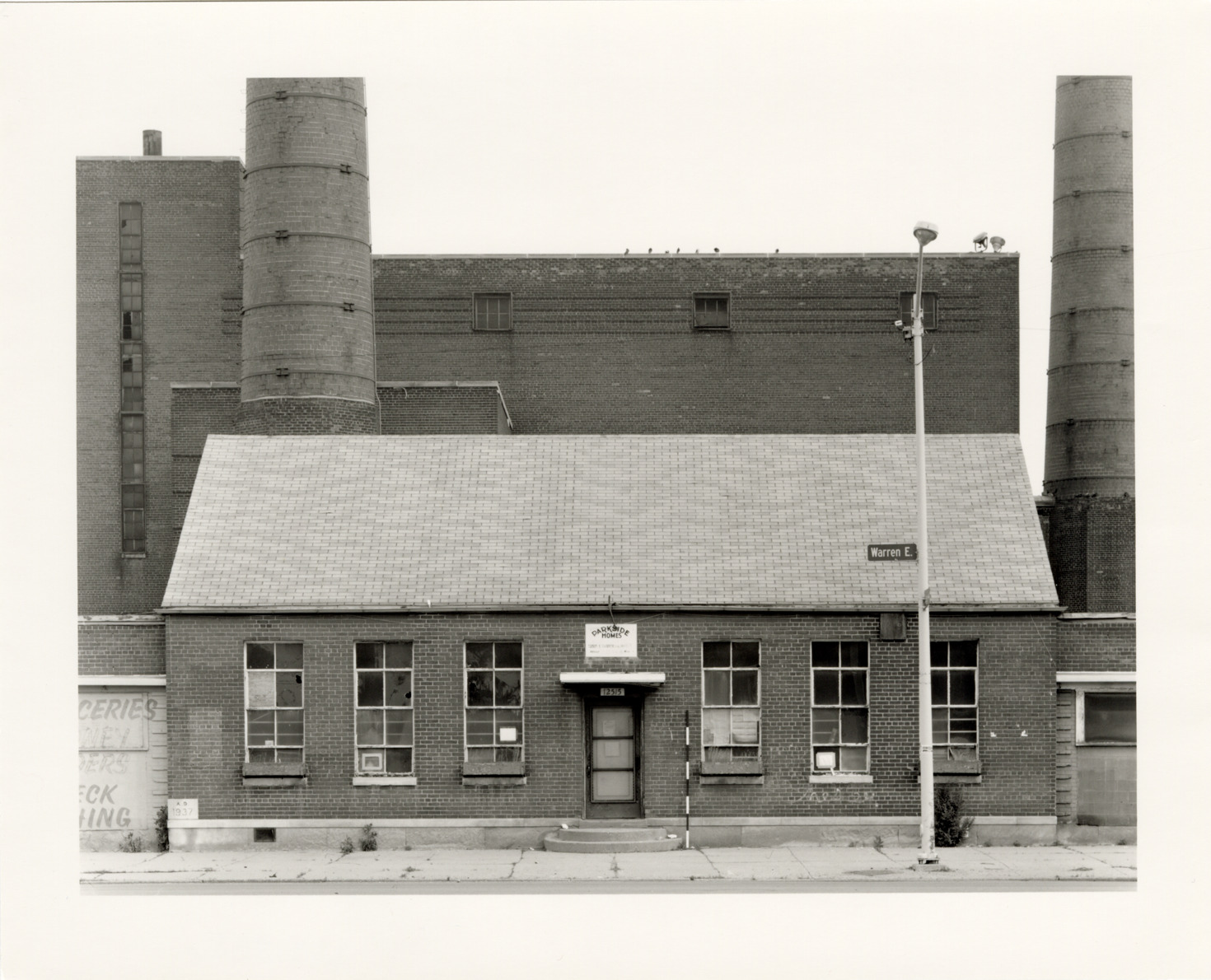 View of the office section of the Administrative Building for Parkside Addition, located at 12515 East Warren Avenue. Sign over door reads: "Parkside Homes." Located at Connor and East Warren Avenues, Parkside Homes was the first federally-funded low-income public housing project built in Detroit and Michigan. Finding aid: "Front of office section, with measuring device."