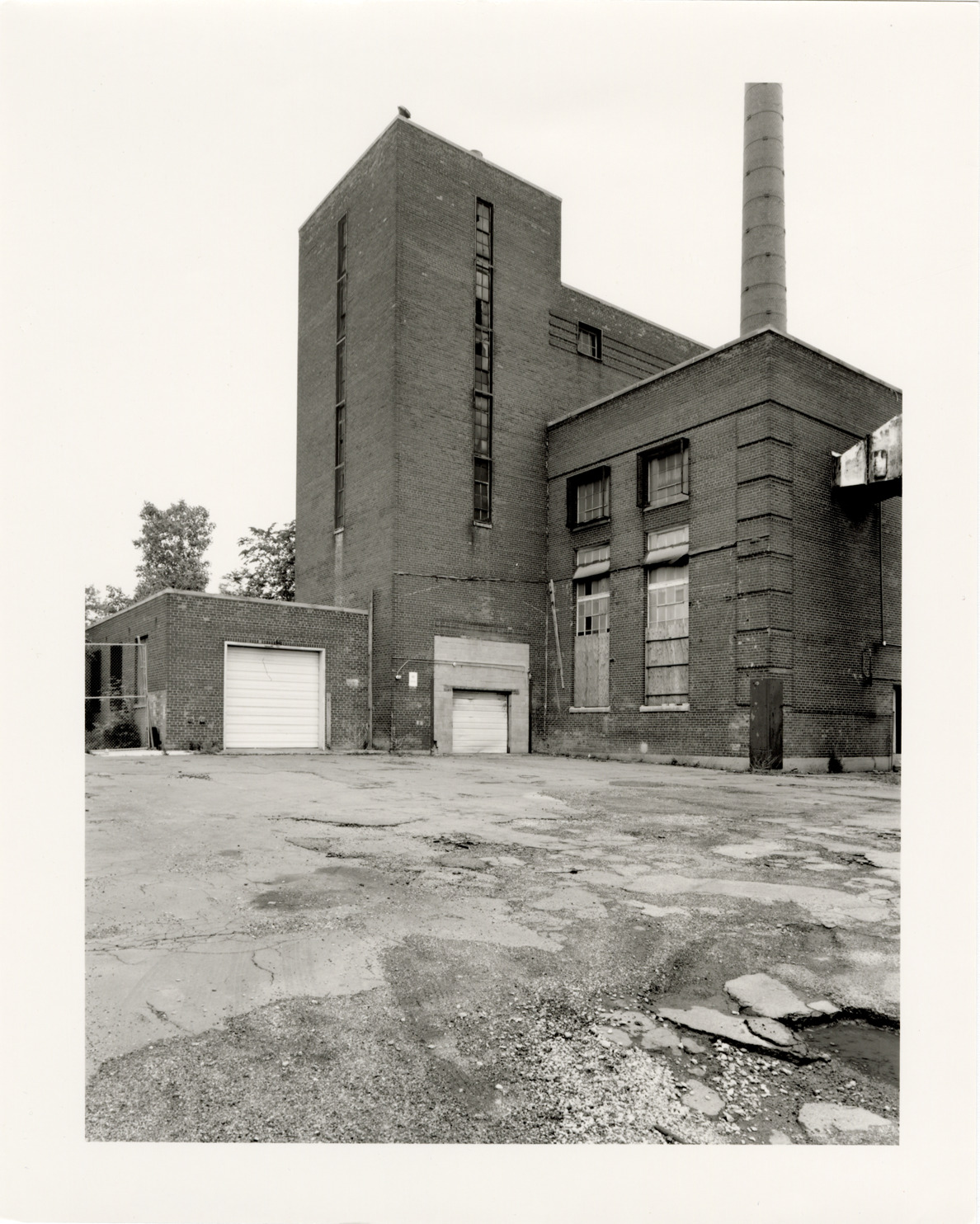 View of the central heating plant and smokestacks for Parkside Homes and Addition, located behind 12515 East Warren Avenue. Located at Connor and East Warren Avenues, Parkside Homes was the first federally-funded low-income public housing project built in Detroit and Michigan. Finding aid: "Left side."