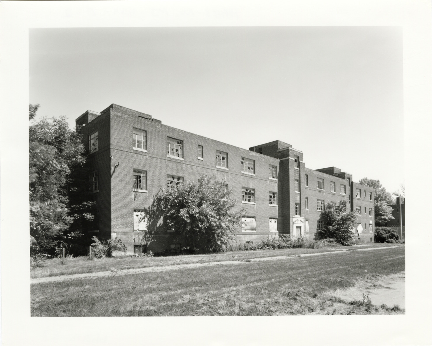 View of PWA apartment building 603 at Parkside Homes and Addition. Located at Connor and East Warren Avenues, Parkside Homes was the first federally-funded low-income public housing project built in Detroit and Michigan. Finding aid: "Front, building 603."