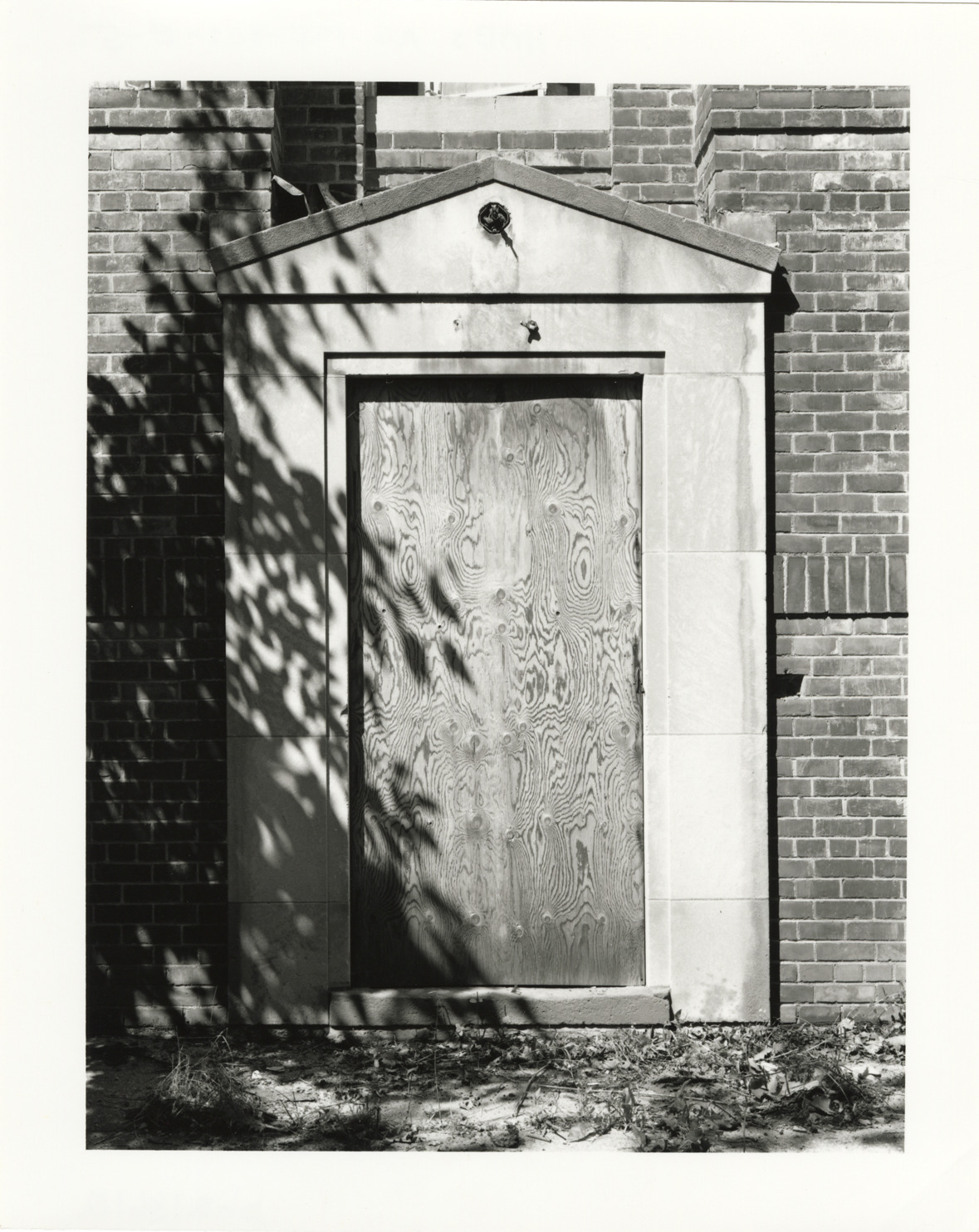 View of boarded-up door at PWA apartment buildings, Parkside Homes and Addition. Located at Connor and East Warren Avenues, Parkside Homes was the first federally-funded low-income public housing project built in Detroit and Michigan. Finding aid: "Standard doorway, with continuous pediment."
