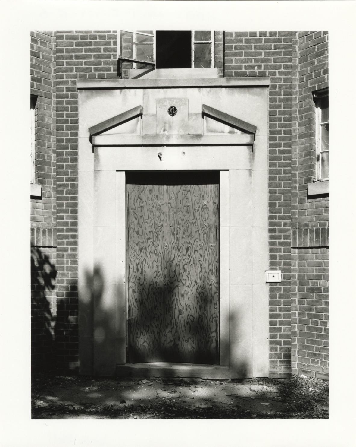 View of boarded-up door at PWA apartment buildings, Parkside Homes and Addition. Located at Connor and East Warren Avenues, Parkside Homes was the first federally-funded low-income public housing project built in Detroit and Michigan. Finding aid: "Standard doorway, with broken pediment."