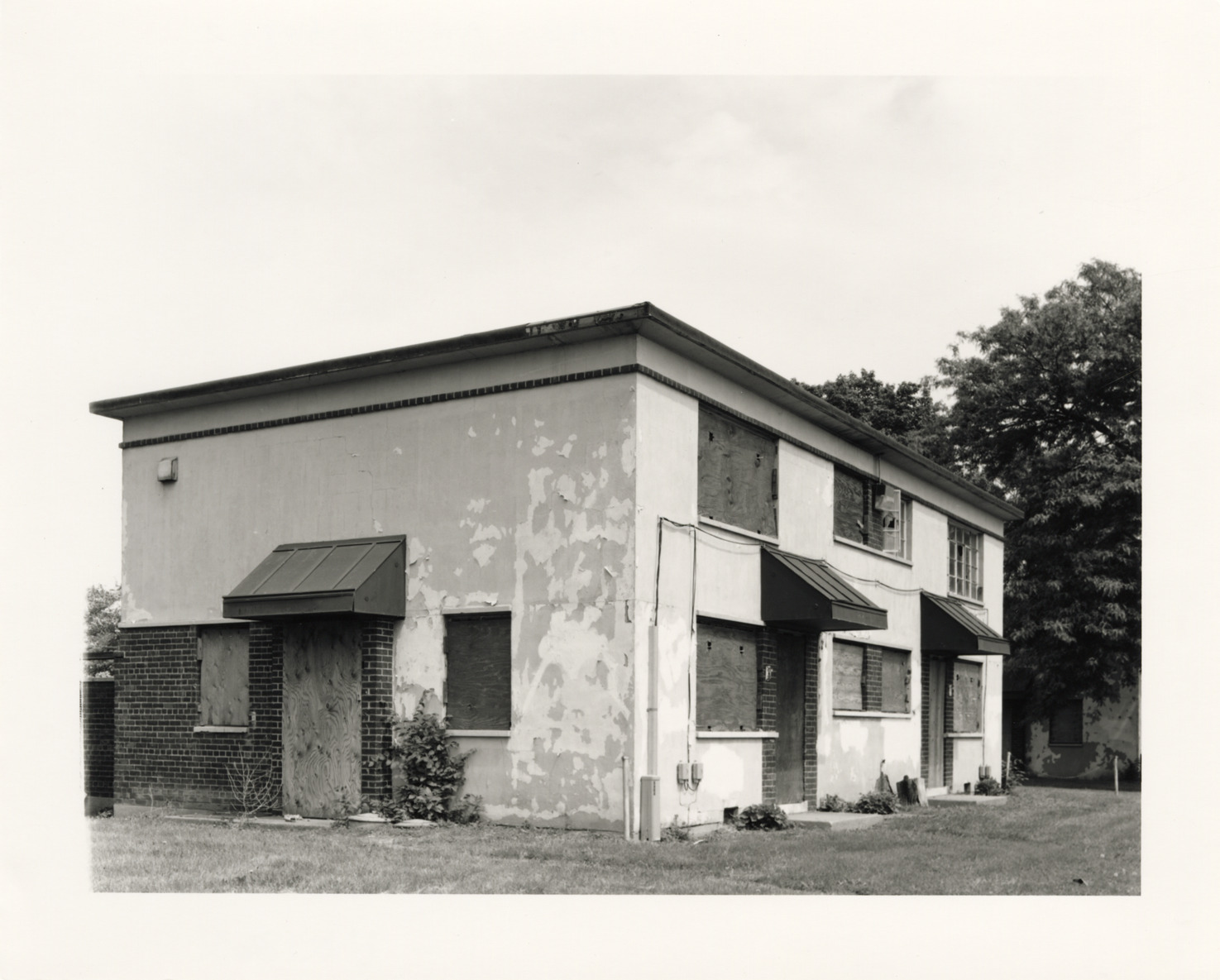 View of building 201, a Type 1 World War II era building, Parkside Homes and Addition. Located at Connor and East Warren Avenues, Parkside Homes was the first federally-funded low-income public housing project built in Detroit and Michigan. Finding aid: "View east, front and west end of building 201."