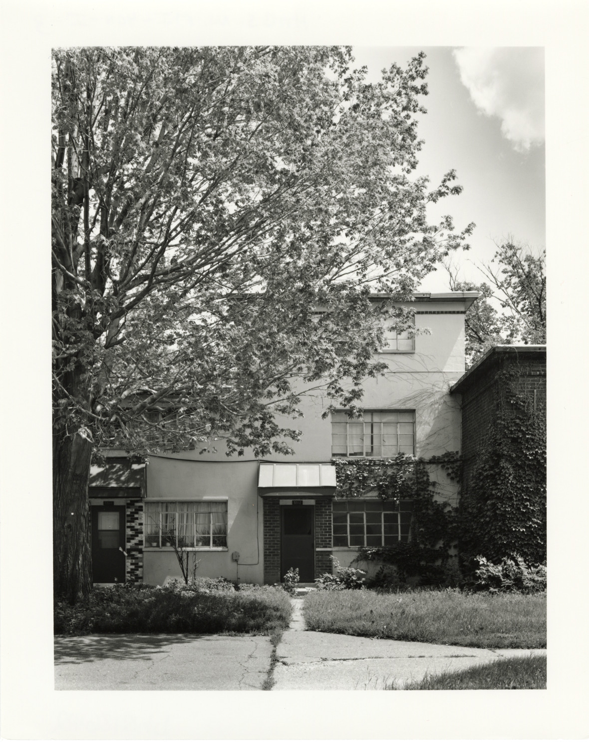 View of building 205, a Type 2 World War II era building, Parkside Homes and Addition. Located at Connor and East Warren Avenues, Parkside Homes was the first federally-funded low-income public housing project built in Detroit and Michigan. Finding aid: "View southeast, west side of three-story section of building 205."