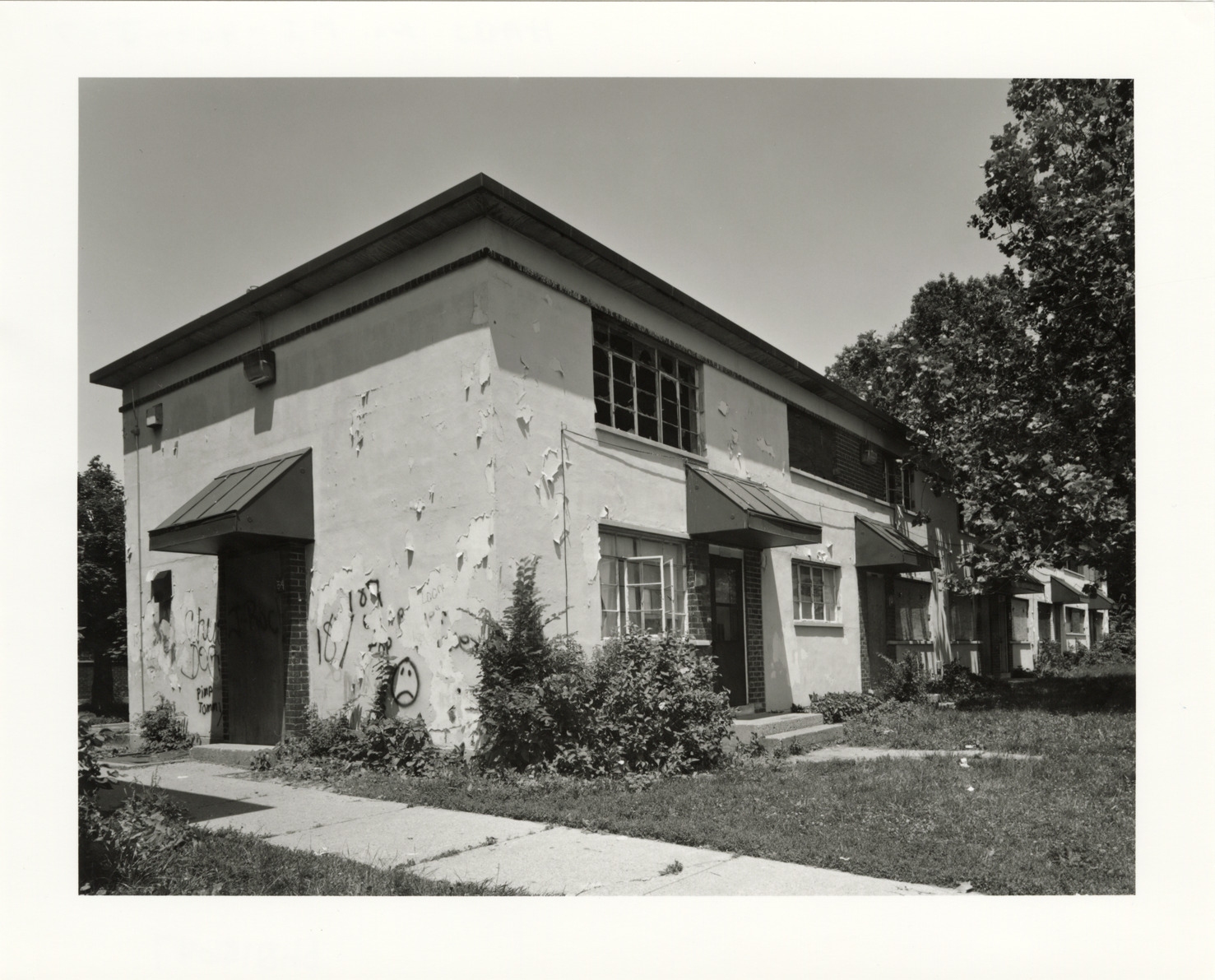 View of building 406, a Type 3 World War II era building, Parkside Homes and Addition. Located at Connor and East Warren Avenues, Parkside Homes was the first federally-funded low-income public housing project built in Detroit and Michigan. Finding aid: "View northwest, east and south sides of building 406."