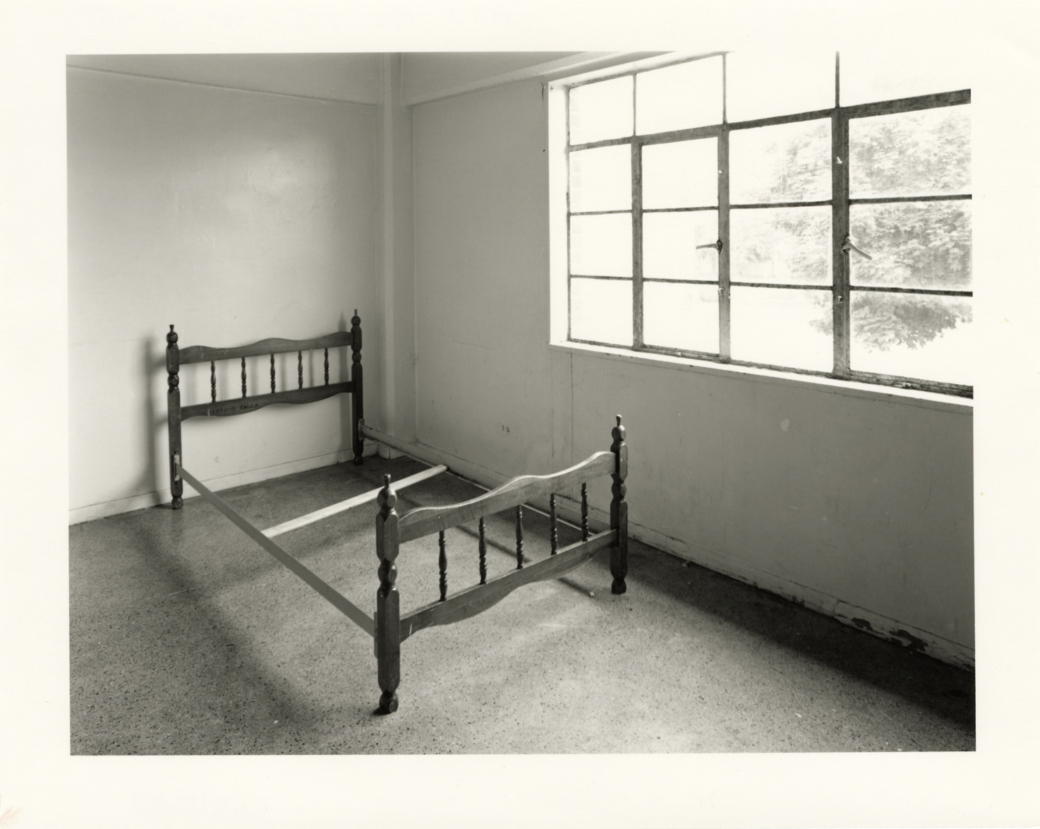 View of bed frame in bedroom of row house, Type 3 World War II era building, Parkside Homes and Addition. Located at Connor and East Warren Avenues, Parkside Homes was the first federally-funded low-income public housing project built in Detroit and Michigan. Finding aid: "Typical bedroom, second story of row houses."