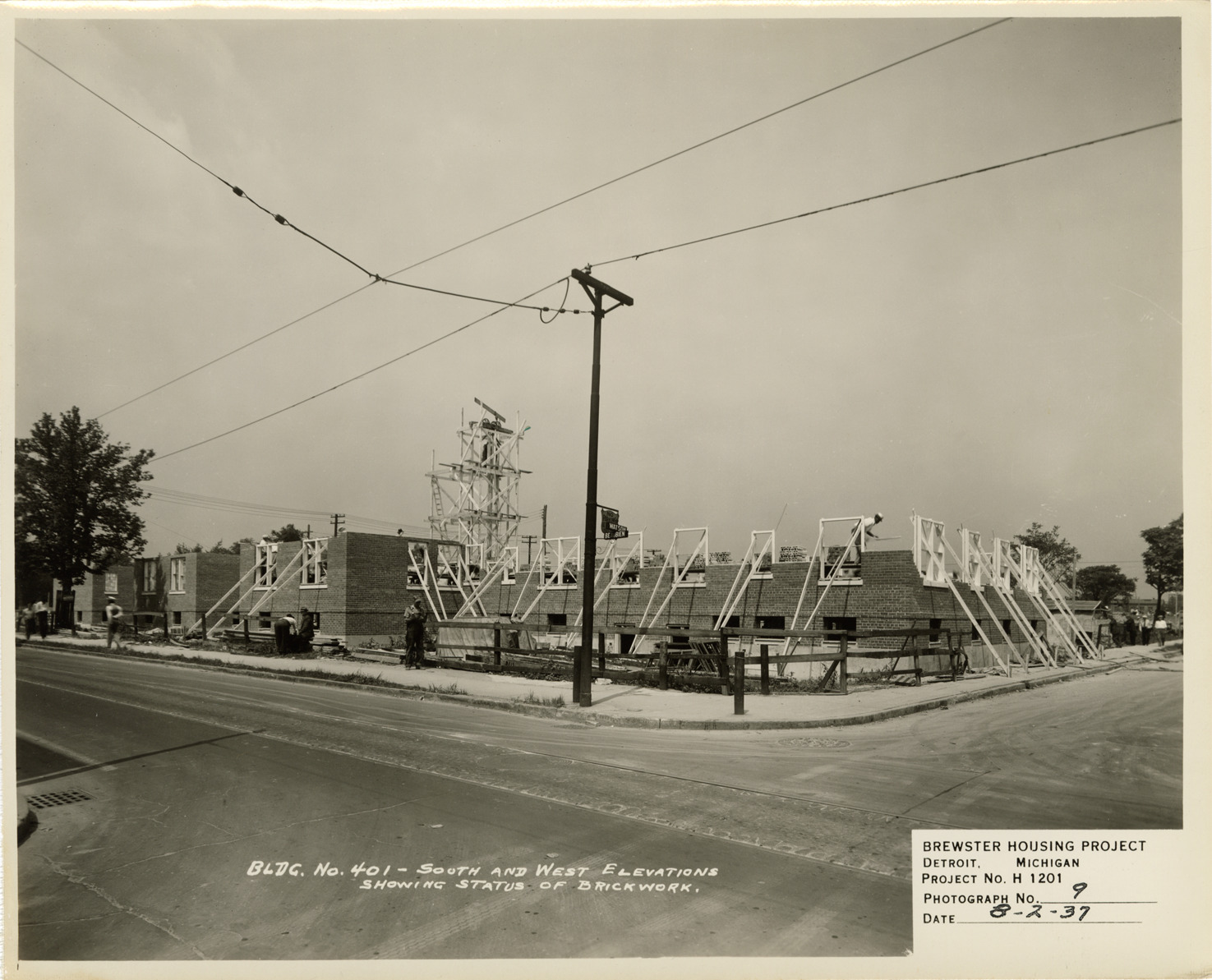 View of bricklayers constructing walls for Building no. 401, during construction of Brewster Housing Project. Printed on front: "Bldg. no. 401. South and west elevations showing status of brickwork. Brewster Housing Project, Detroit, Michigan. Project no. H 1201. Photograph no. 9. Date: 8-2-37."
