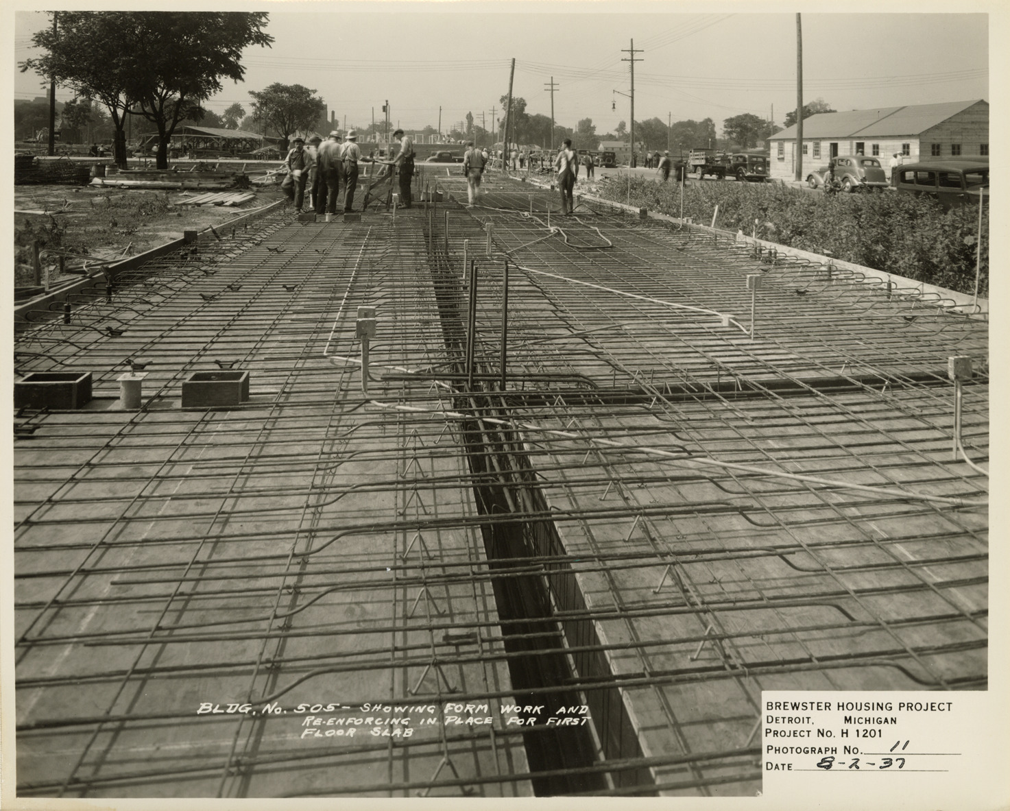 View of workers installing rebar for floor slab of Building no. 505, during construction of Brewster Housing Project. Printed on front: "Bldg. no. 505. Showing form work and re-enforcing in place for first floor slab. Brewster Housing Project, Detroit, Michigan. Project no. H 1201. Photograph no. 11. Date: 8-2-37."