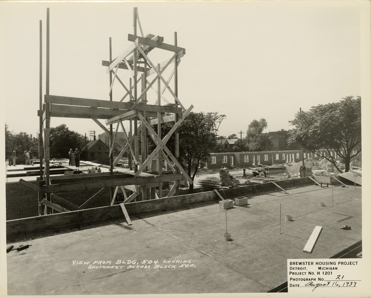 View of workers on construction site for 500 block, during construction of Brewster Housing Project. Printed on front: "View from Bldg. no. 504 looking southwest across block 500. Brewster Housing Project, Detroit, Michigan. Project no. H 1201. Photograph no. 21. Date: August 16, 1937."