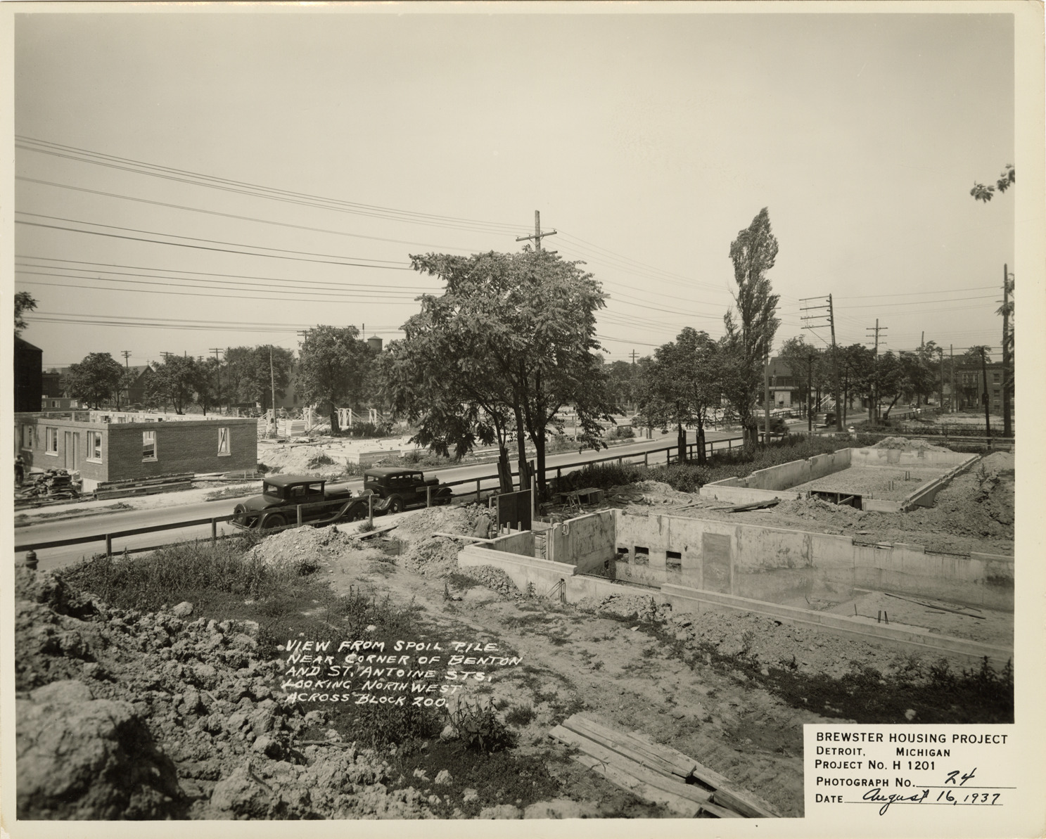 View of foundations and construction site for 200 block, during construction of Brewster Housing Project; also showing partially completed buildings. Cars parked in street. Printed on front: "View from spoil pile near corner of Benton and St. Antoine Sts., looking northwest across block 200. Brewster Housing Project, Detroit, Michigan. Project no. H 1201. Photograph no. 24. Date: August 16, 1937."