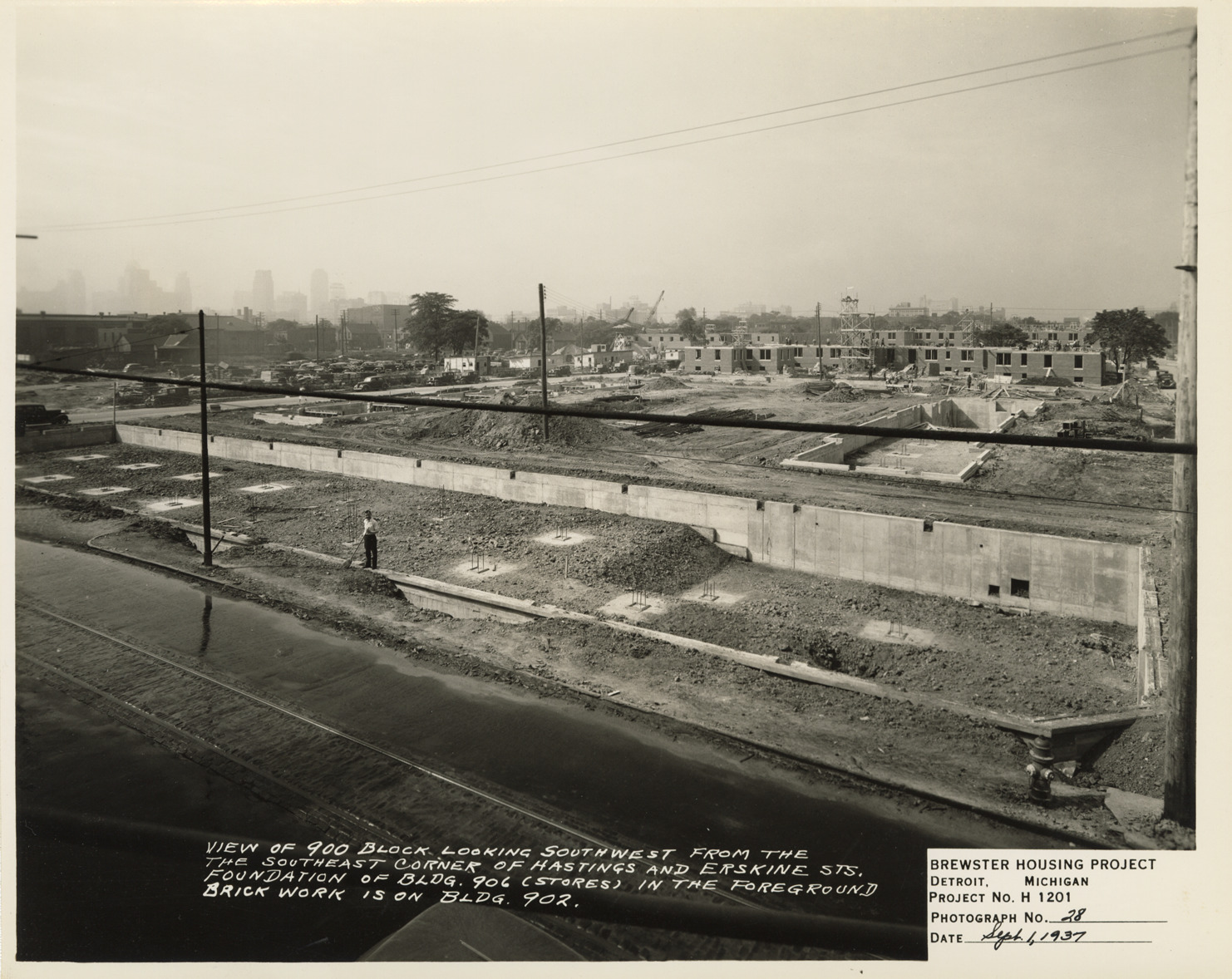 View of construction site for 900 block and foundation for Building no. 906, during construction of Brewster Housing Project. Building no. 902 in background. Printed on front: "View of 900 block looking southwest from the southeast corner of Hastings and Erskine Sts. Foundation of Bldg. 906 (stores) in the foreground. Brick work is on Building 902. Brewster Housing Project, Detroit, Michigan. Project no. H 1201. Photograph no. 28. Date: September 1, 1937."