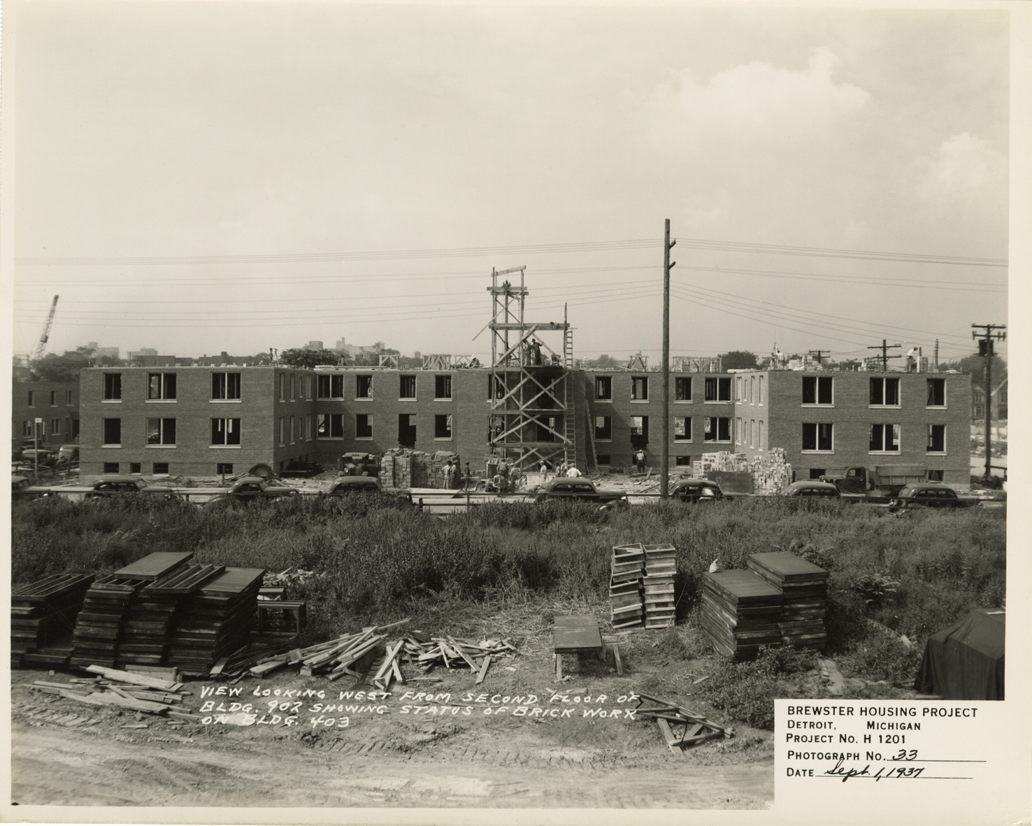 View of Building no. 403, during construction of Brewster Housing Project. Cars parked in street; lumber and pallets in foreground. Printed on front: "View looking west from second floor of Bldg. 902 showing status of brick work on Bldg. 403. Brewster Housing Project, Detroit, Michigan. Project no. H 1201. Photograph no. 33. Date: September 1, 1937."