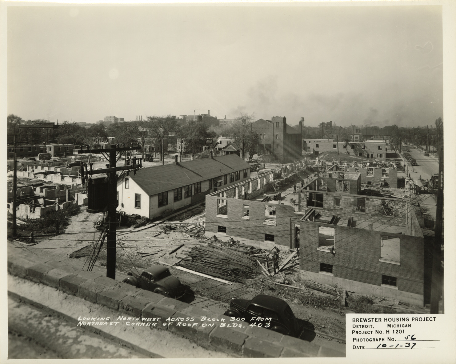 View of partially completed buildings on construction site for 300 block, Brewster Housing Project. Cars parked in foreground. Printed on front: "Looking northwest across block 300 from northeast corner of roof on Bldg. 403. Project no. H 1201. Photograph no. 56. Date: 10-1-37."
