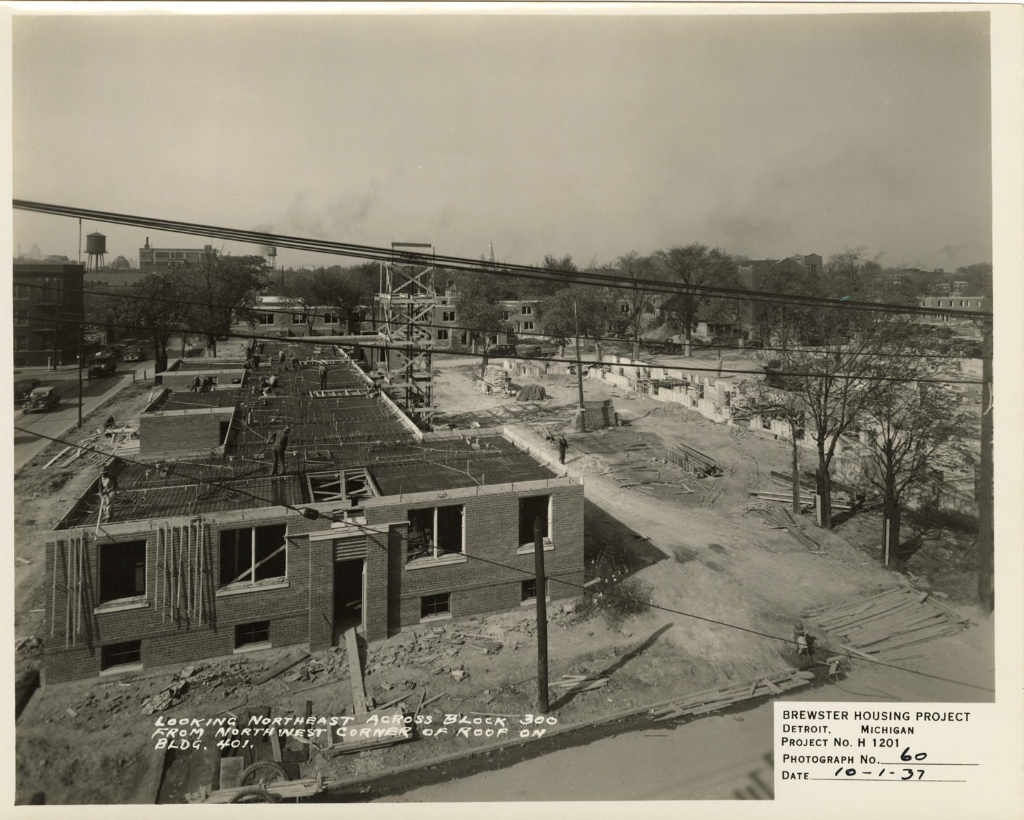 View of partially completed buildings on construction site for 300 block, Brewster Housing Project. Printed on front: "Looking northeast across block 300 from northwest corner of roof on Bldg. 401. Project no. H 1201. Photograph no. 60. Date: 10-1-37."