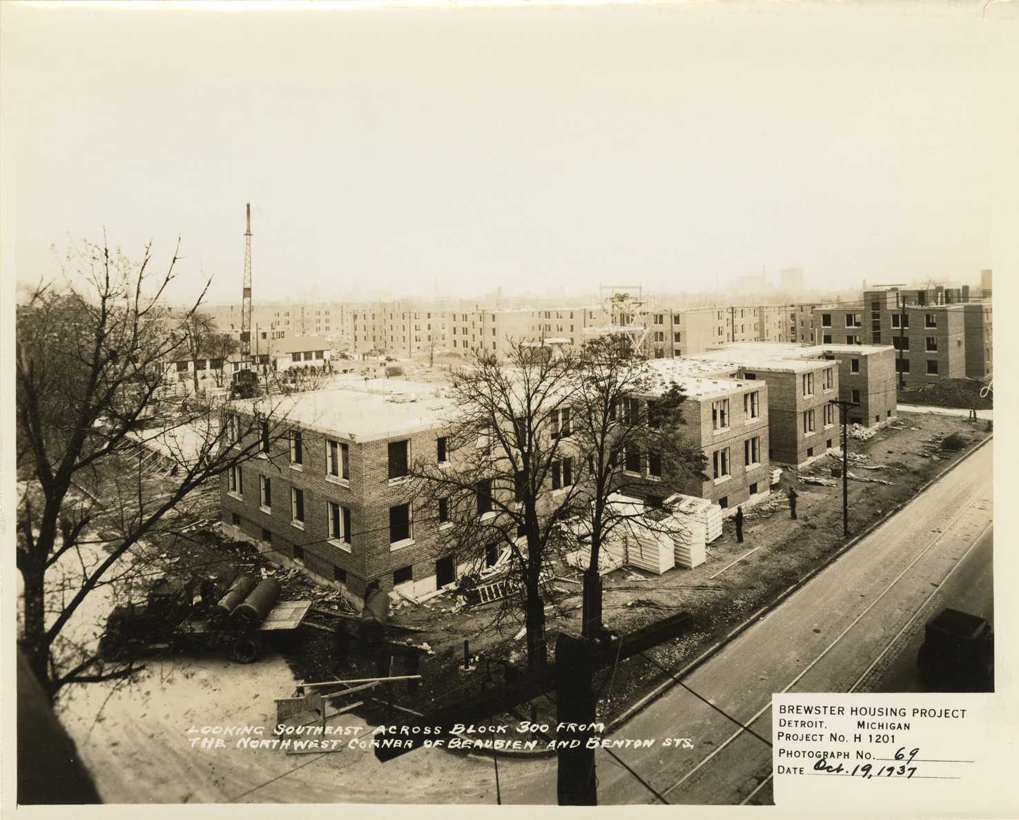 View of buildings under construction on 300 block, Brewster Housing Project. Printed on front: "Looking southeast across block 300 from northwest corner of Beaubien and Benton Sts. Project no. H 1201. Photograph no. 69. Date: Oct. 19, 1937."