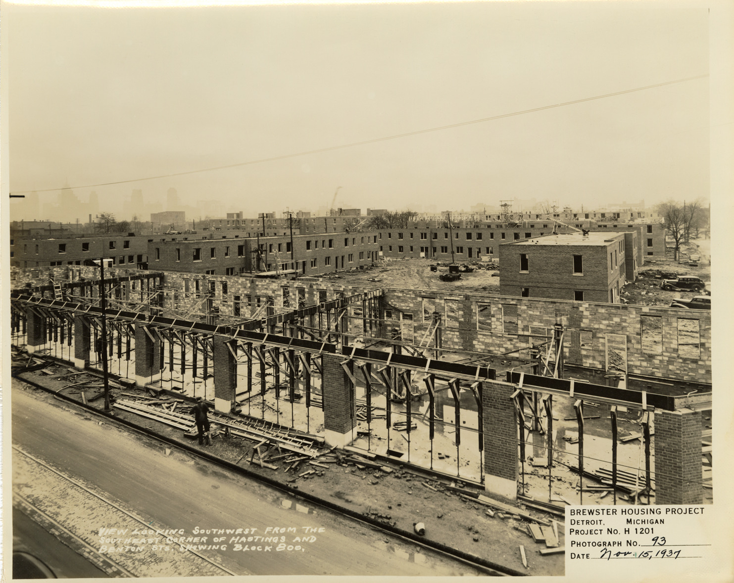 View of buildings under construction on 800 block, Brewster Housing Project. Printed on front: "View looking southwest from the southeast corner of Hastings and Benton Sts. showing block 800. Project no. H 1201. Photograph no. 93. Date: Nov. 15, 1937."
