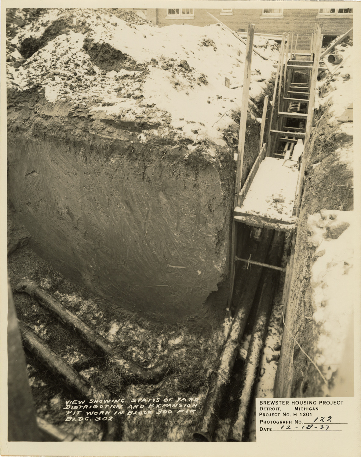 View of yard distribution work in 300 block for Building no. 302, Brewster Housing Project during construction. Printed on front: "View showing status of yard distribution and expansion pit work in block 300 for Bldg. 302. Brewster Housing Project. Detroit, Michigan. Project no. H 1201. Photograph no. 122. Date: 12-18-37."
