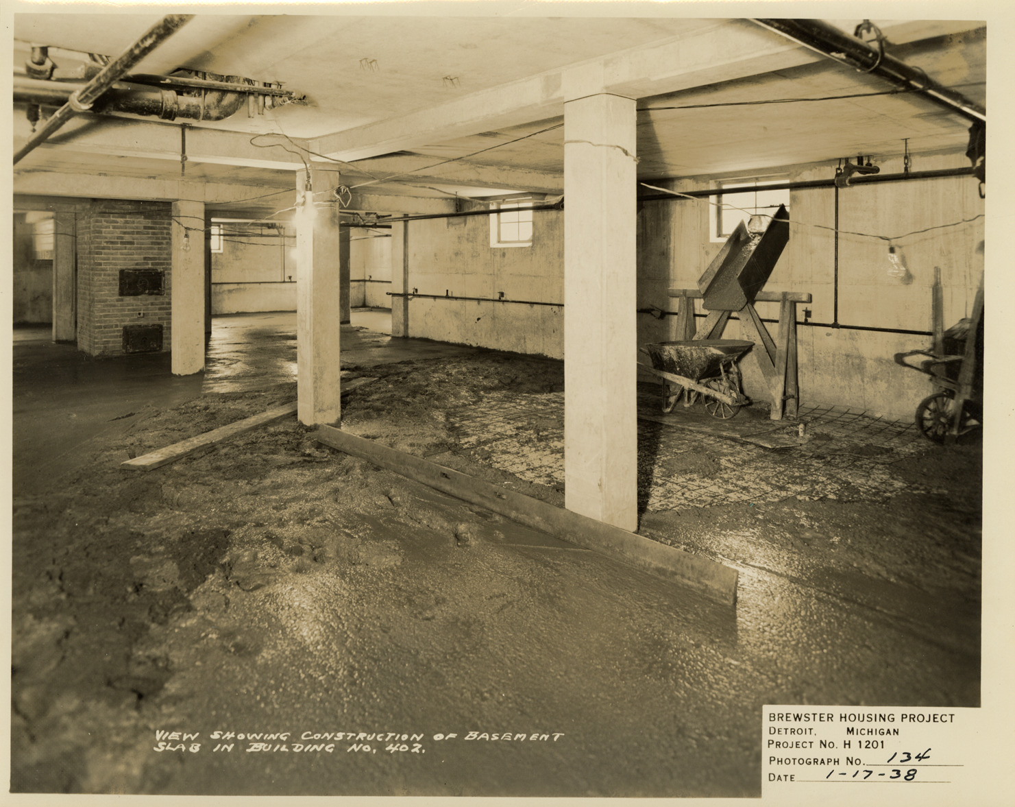 View of construction of basement slab in Building no. 402, Brewster Housing Project . Printed on front: "View showing construction of basement slab in Building no. 402. Brewster Housing Project. Detroit, Michigan. Project no. H 1201. Photograph no. 134. Date: 1-17-38."