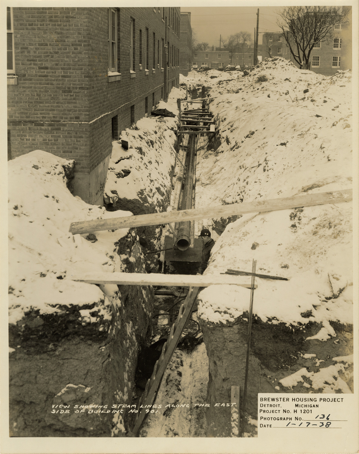 View of steam lines along Building no. 901, Brewster Housing Project during construction. Printed on front: "View showing steam lines along the east side of Building no. 901. Brewster Housing Project. Detroit, Michigan. Project no. H 1201. Photograph no. 136. Date: 1-17-38."