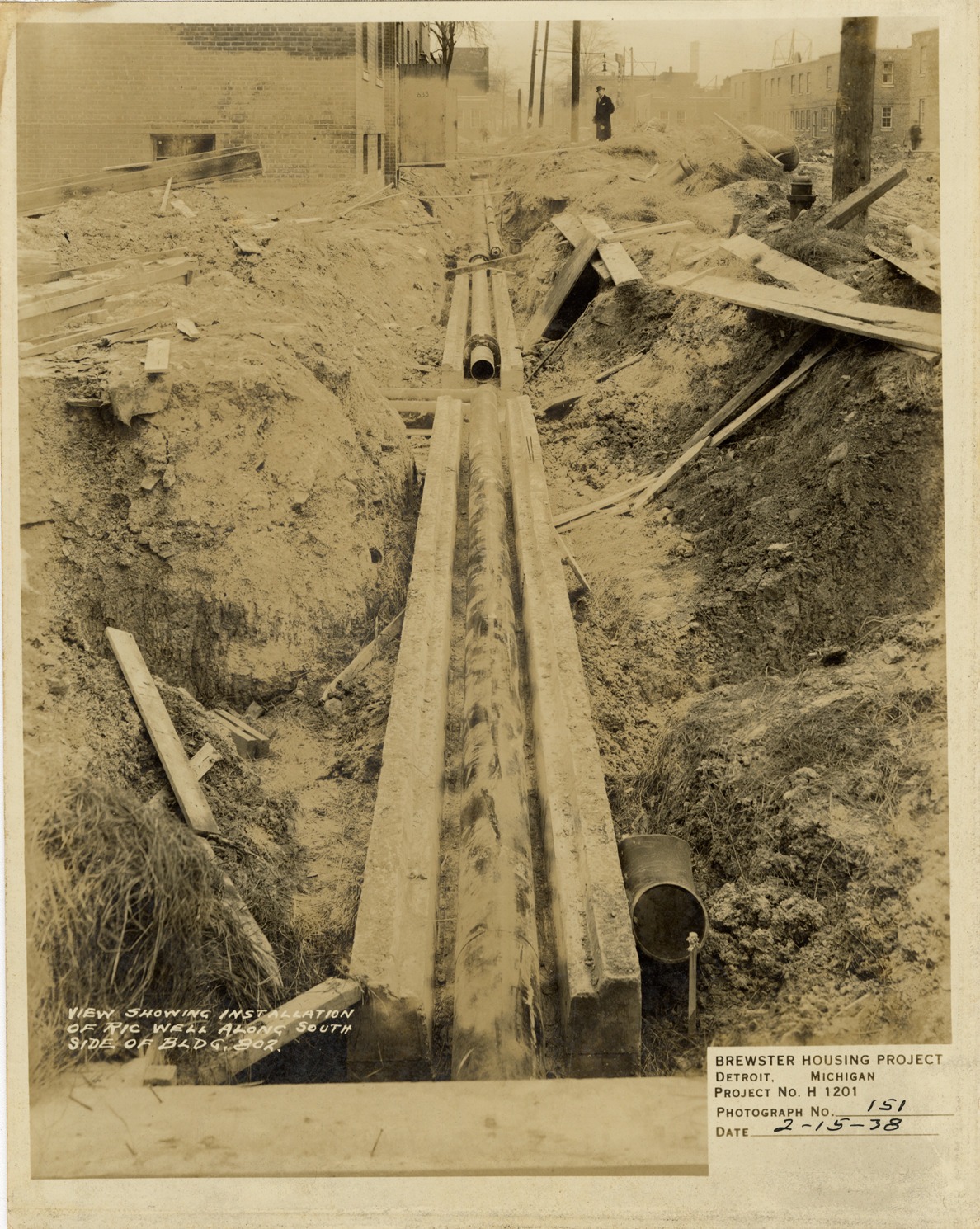 View of installation of Ric-Wil steam pipe insulation adjacent to Building no. 802, Brewster Housing Project during construction. Printed on front: "View showing installation of Ric Well [sic] along south side of Bldg. 802. Brewster Housing Project. Detroit, Michigan. Project no. H 1201. Photograph no. 151. Date: 2-15-38."