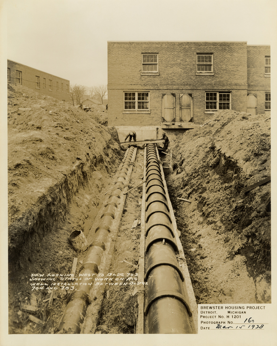 View of workers installing Ric-Wil steam pipe insulation between Building no. 704 and no. 703, Brewster Housing Project during construction. Printed on front: "View looking west to Bldg. 703 showing status of work on Ric Well [sic] installation between Bldgs. 704 and 703. Brewster Housing Project. Detroit, Michigan. Project no. H 1201. Photograph no. 160. Date: Mar. 15, 1938."