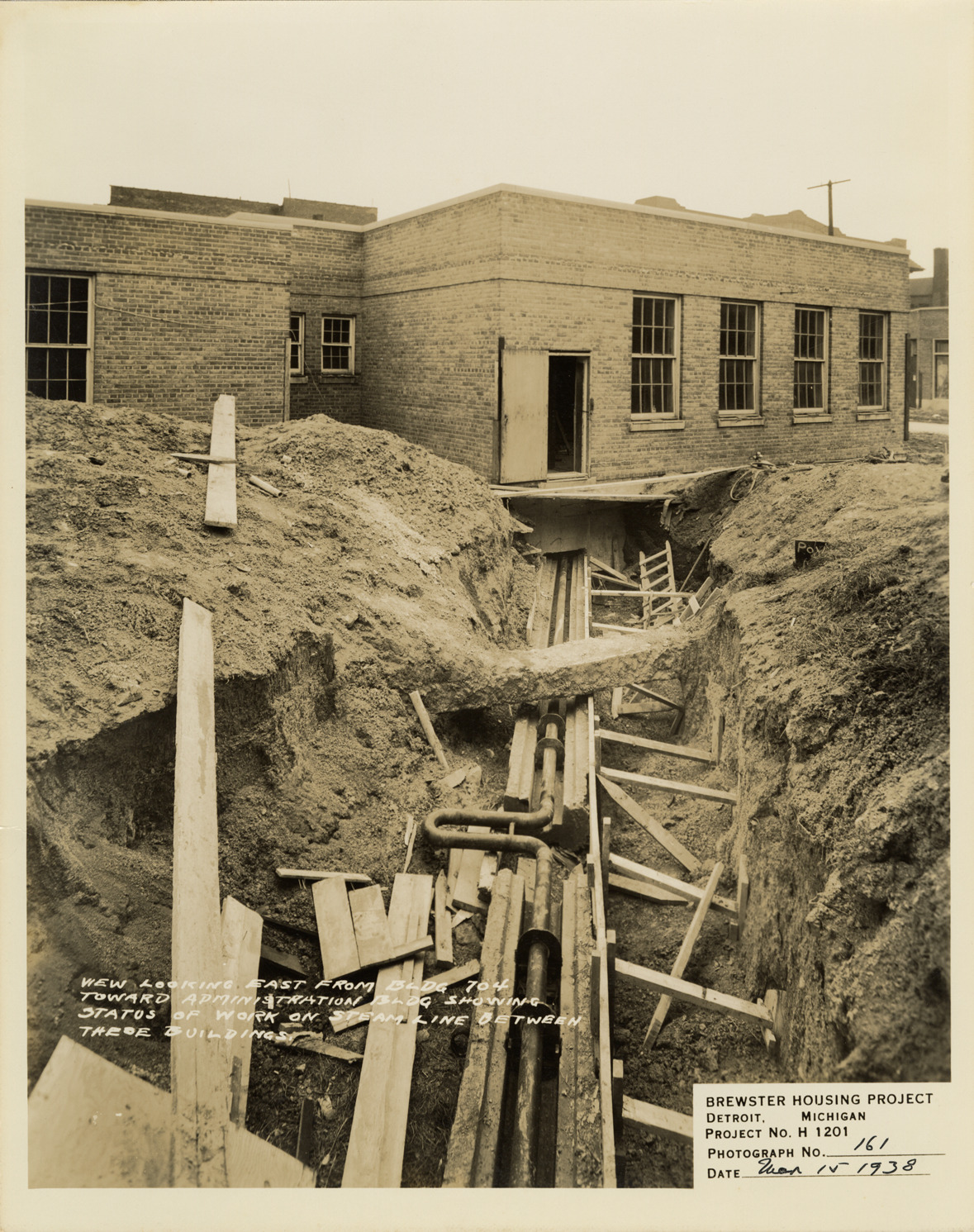 View of steam line between Building no. 704 and Administration Building, Brewster Housing Project during construction. Printed on front: "View looking east from Bldg. 704 toward Administration Bldg. showing status of work on steam line between these buildings. Brewster Housing Project. Detroit, Michigan. Project no. H 1201. Photograph no. 161. Date: Mar. 15, 1938."