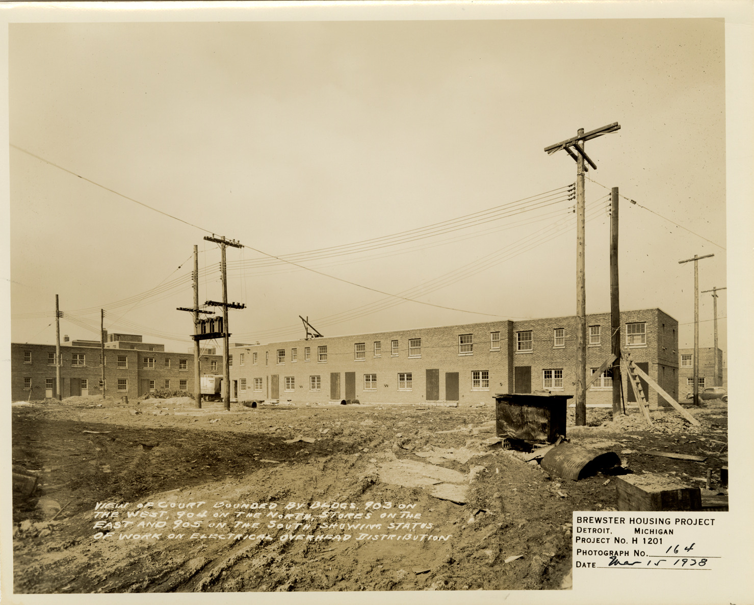 View of electrical overhead installation, Brewster Housing Project during construction. Printed on front: "View of court bounded by Bldgs. 903 on the west, 904 on the north, stores on the east and 905 on the south showing status of work on electrical overhead distribution. Brewster Housing Project. Detroit, Michigan. Project no. H 1201. Photograph no. 164. Date: Mar. 15, 1938."