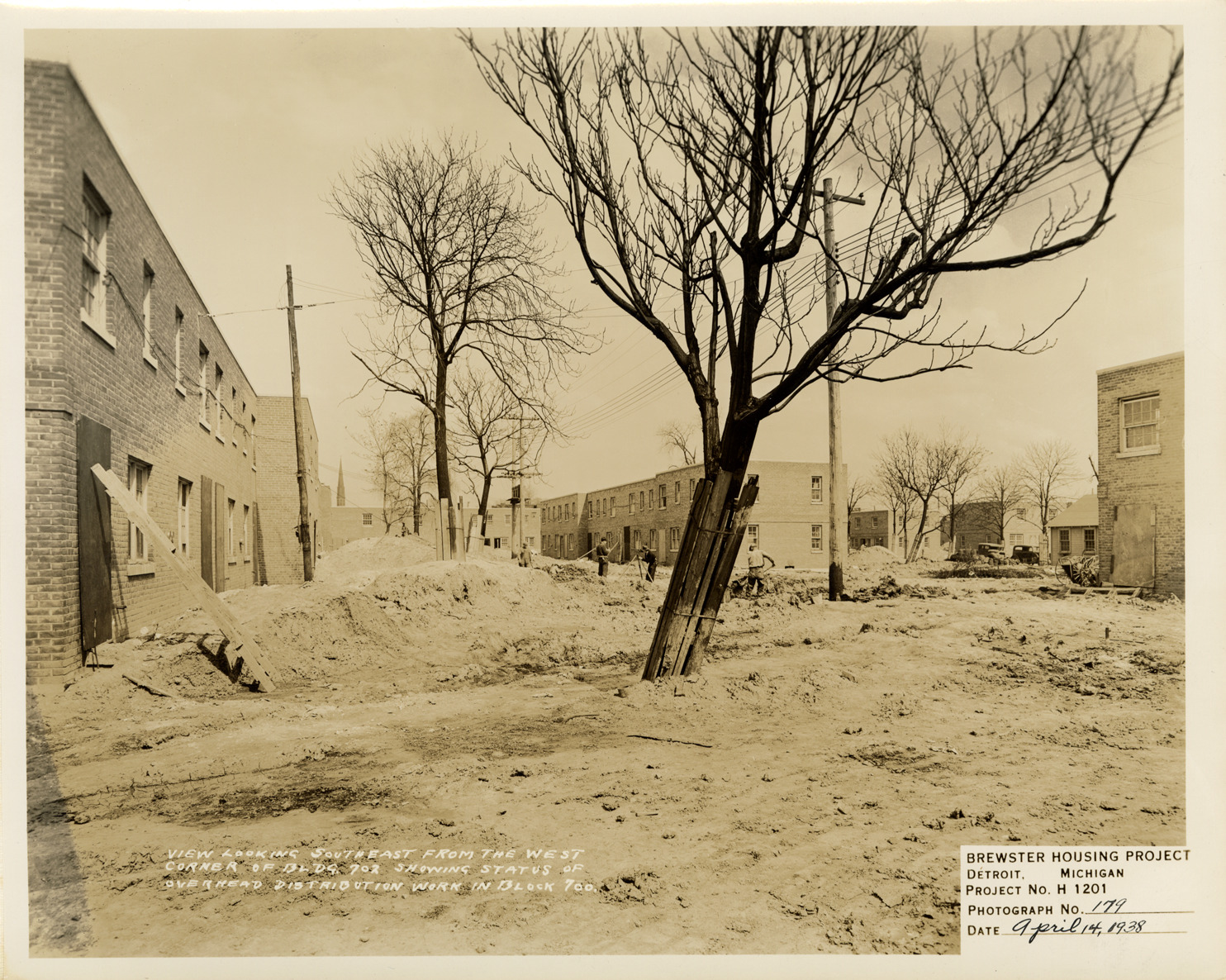 View of electrical overhead installation on 700 block, Brewster Housing Project during construction. Workers in background. Printed on front: "View looking southeast from the west corner of Bldg. 702 showing status of overhead distribution work in block 700. Brewster Housing Project. Detroit, Michigan. Project no. H 1201. Photograph no. 179. Date: April 14, 1938."