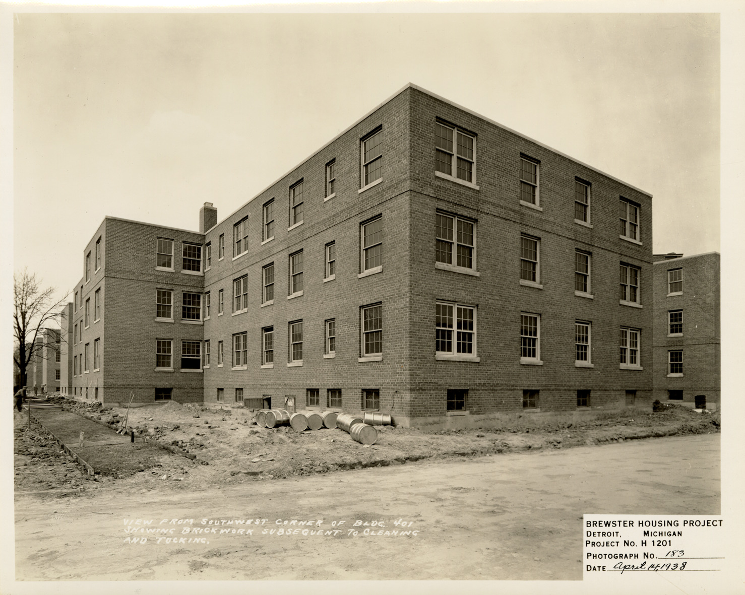 View of Building no. 401 during construction, Brewster Housing Project. Printed on front: "View from southwest corner of Bldg. 401 showing brickwork subsequent to cleaning and tucking. Brewster Housing Project. Detroit, Michigan. Project no. H 1201. Photograph no. 183. Date: April 14, 1938."