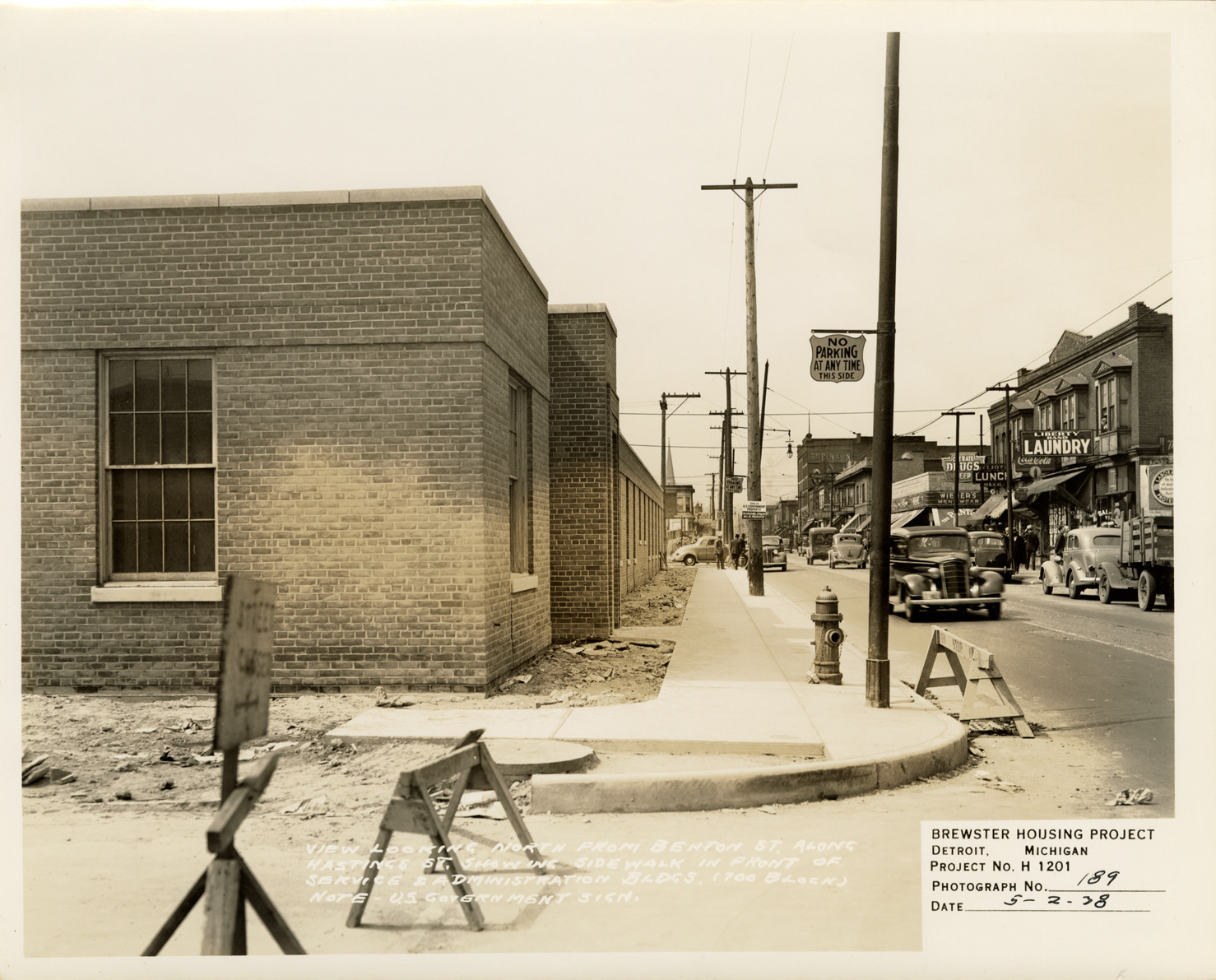 View of sidewalk construction on Hastings St., Brewster Housing Project. Businesses and cars visible in background. Printed on front: "View looking north from Benton St. along Hastings St. showing sidewalk in front of Service & Administration Bldgs. (700 block). Note U.S. government sign. Brewster Housing Project. Detroit, Michigan. Project no. H 1201. Photograph no. 189. Date: 5-2-38."