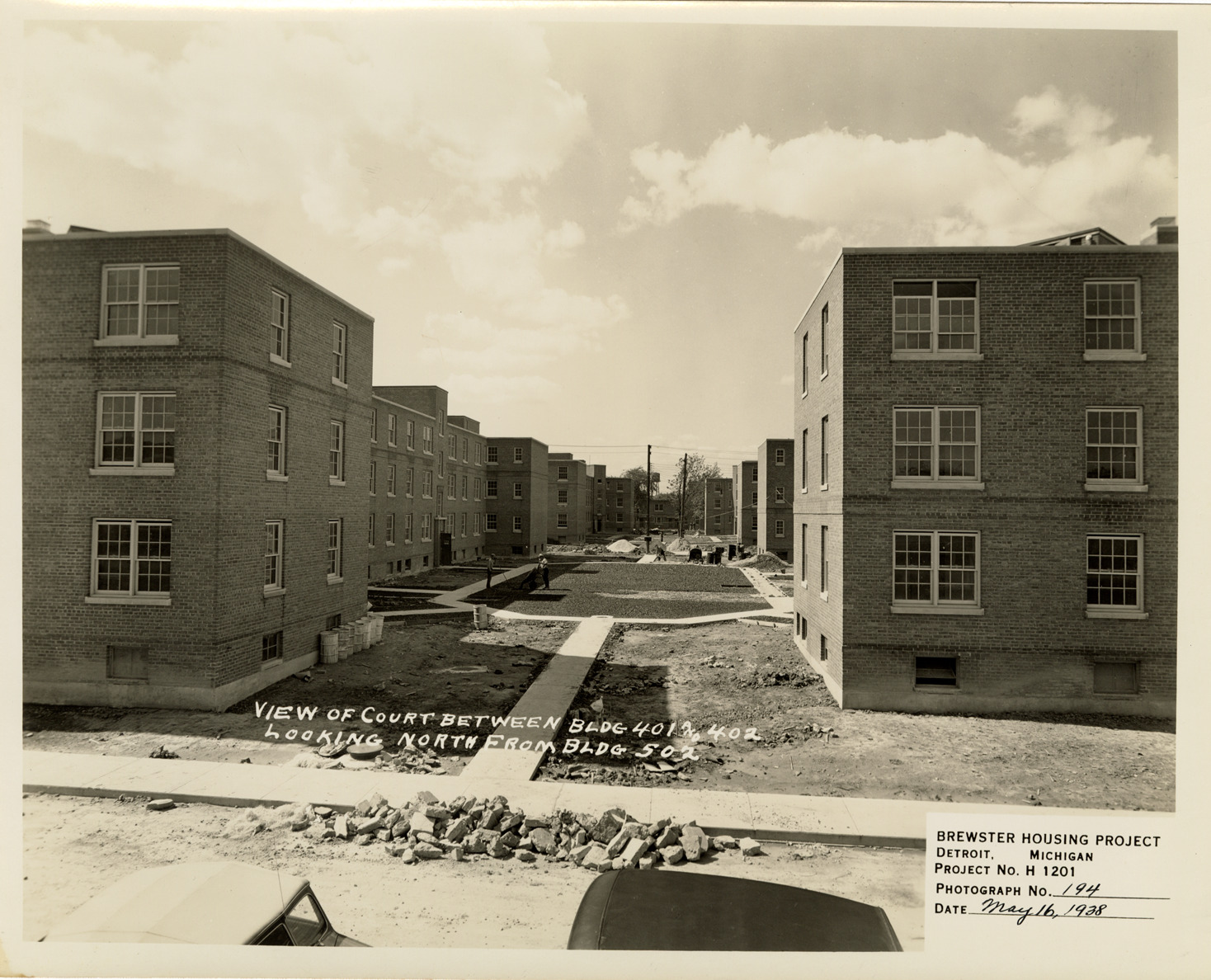 View of court between Building no. 401 and no. 402, Brewster Housing Project during construction. Printed on front: "View of court between Bldg. 401 and 402 looking north from Bldg. 502. Brewster Housing Project. Detroit, Michigan. Project no. H 1201. Photograph no. 194. Date: May 16, 1938."