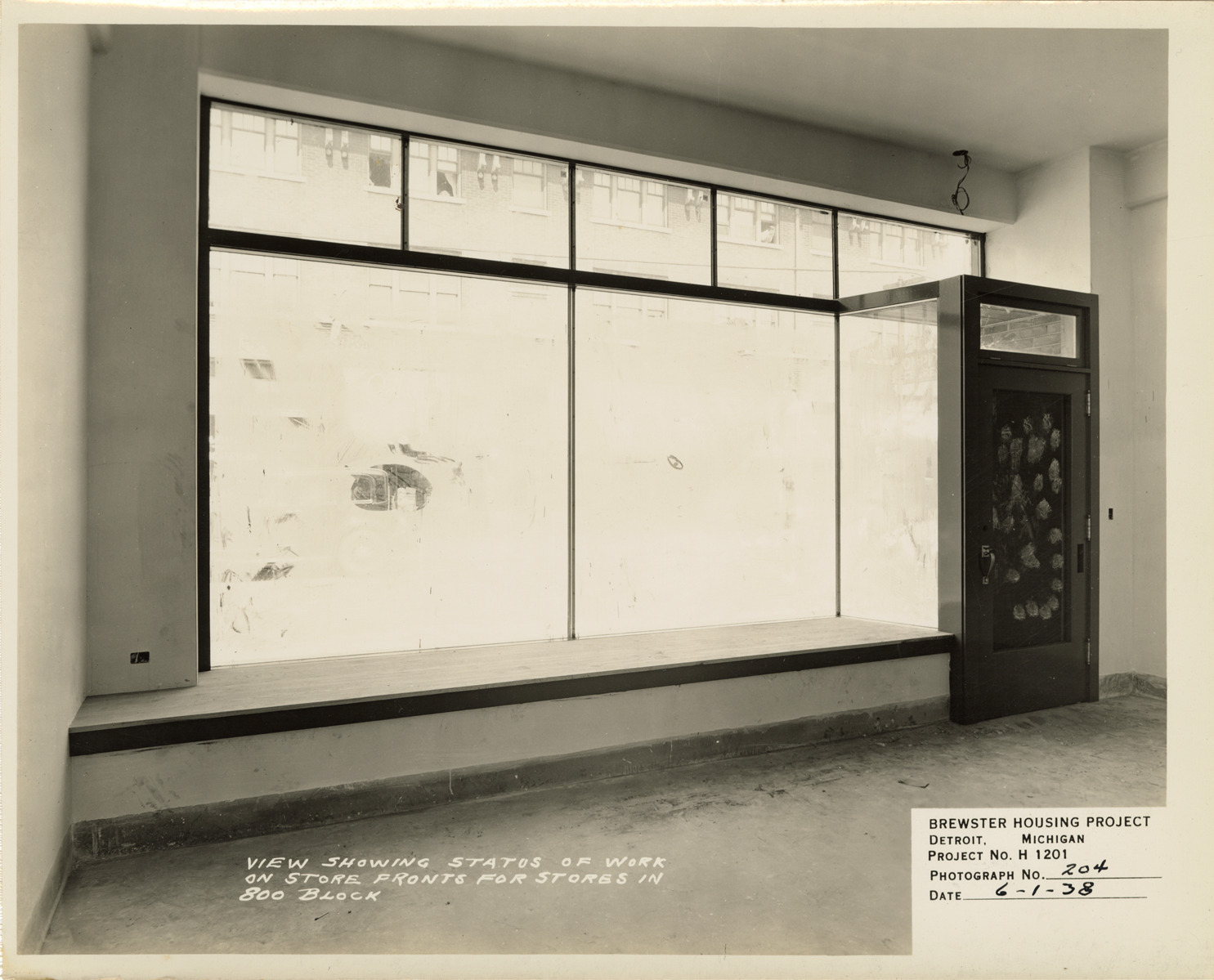 View of storefront in 800 block during construction, Brewster Housing Project. Printed on front: "View showing status of work on store fronts for stores in 800 block. Brewster Housing Project. Detroit, Michigan. Project no. H 1201. Photograph no. 204. Date: 6-1-38."