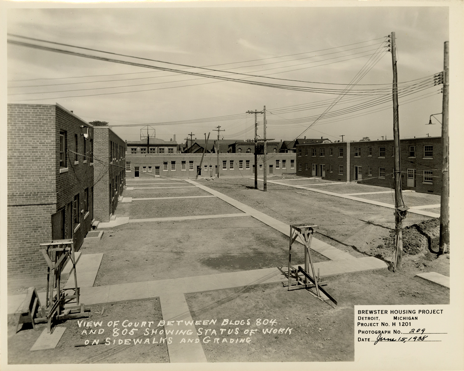 View of sidewalks and grading in court between Building no. 804 and no. 805, Brewster Housing Project during construction. Printed on front: "View of court between Bldgs. 804 and 805 showing status of work on sidewalks and grading. Brewster Housing Project. Detroit, Michigan. Project no. H 1201. Photograph no. 209. Date: June 15, 1938."