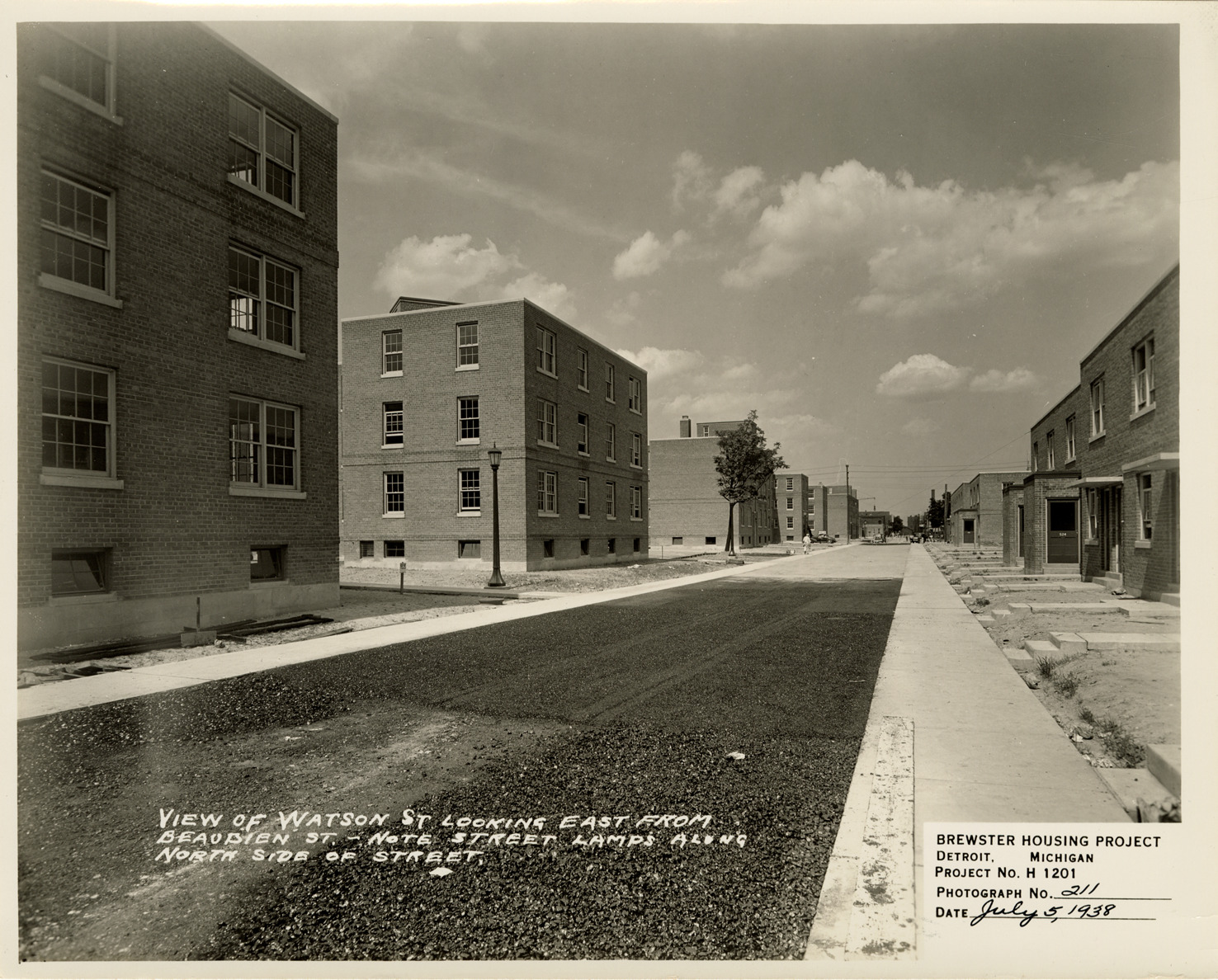 View of Watson Street, Brewster Housing Project during construction. Printed on front: "View of Watson St. looking east from Beaubien St. Note Street lamps along north side of street. Brewster Housing Project. Detroit, Michigan. Project no. H 1201. Photograph no. 211. Date: July 5, 1938."