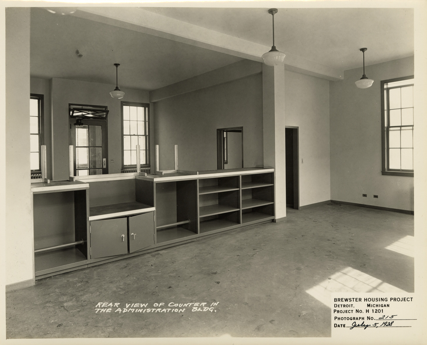 Rear view of counter in the Administration Building, Brewster Housing Project during construction. Printed on front: "Rear view of counter in the Administration Bldg. Brewster Housing Project. Detroit, Michigan. Project no. H 1201. Photograph no. 215. Date: July 5, 1938."