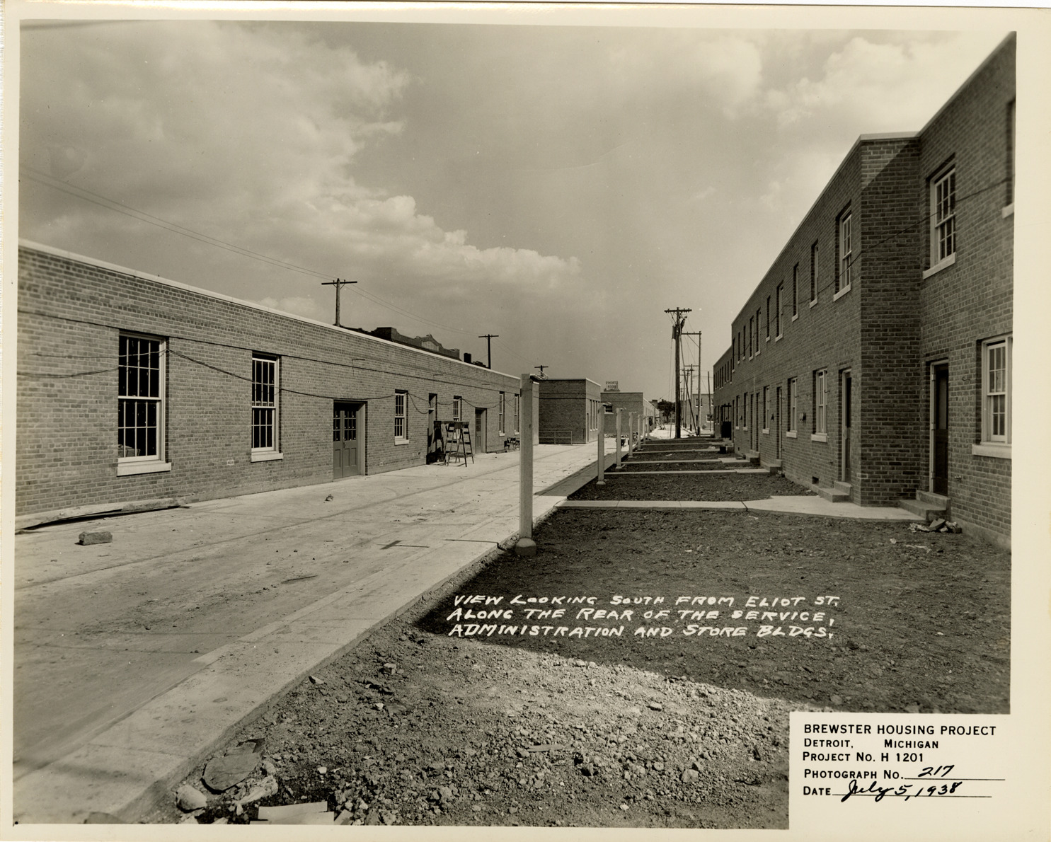 Rear view of stores, Service Building and Administration Building, Brewster Housing Project during construction. Printed on front: "View looking south from Eliot St. along the rear of the Service, Administration and store bldgs. Brewster Housing Project. Detroit, Michigan. Project no. H 1201. Photograph no. 217. Date: July 5, 1938."