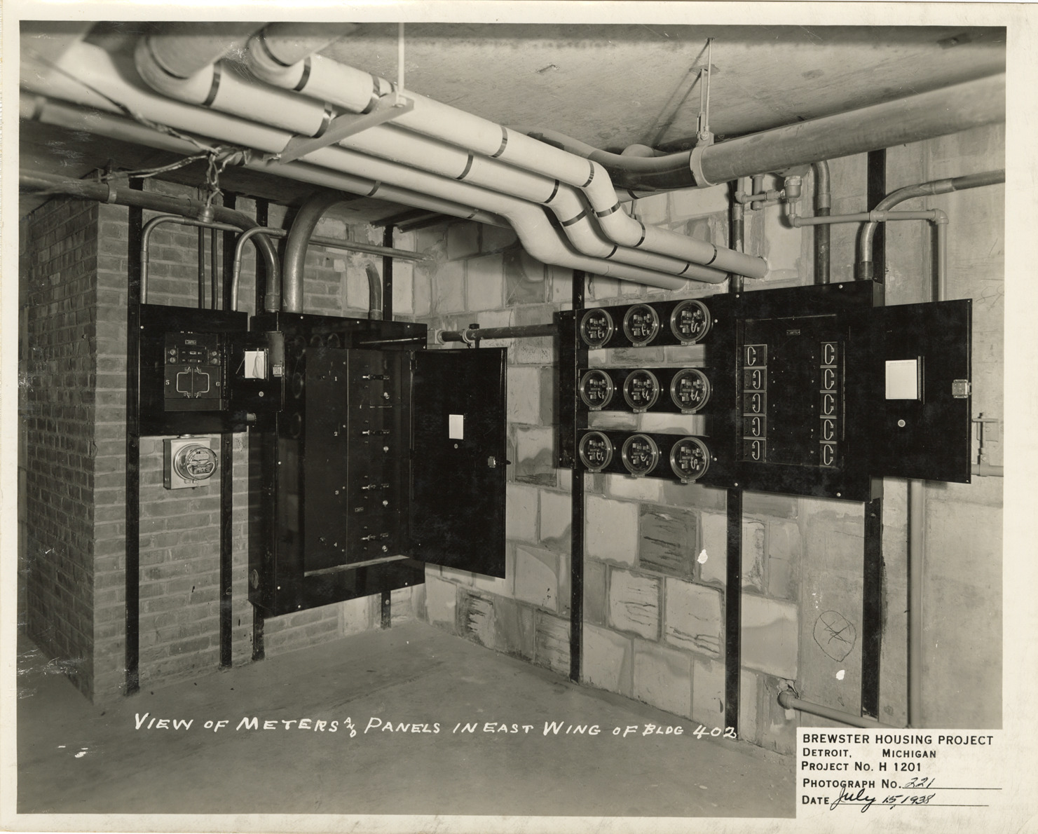View of electric meters and panels in Building no. 402 during construction, Brewster Housing Project. Printed on front: "View of meters and panels in east wing of Bldg. 402. Brewster Housing Project. Detroit, Michigan. Project no. H 1201. Photograph no. 221. Date: July 15, 1938."