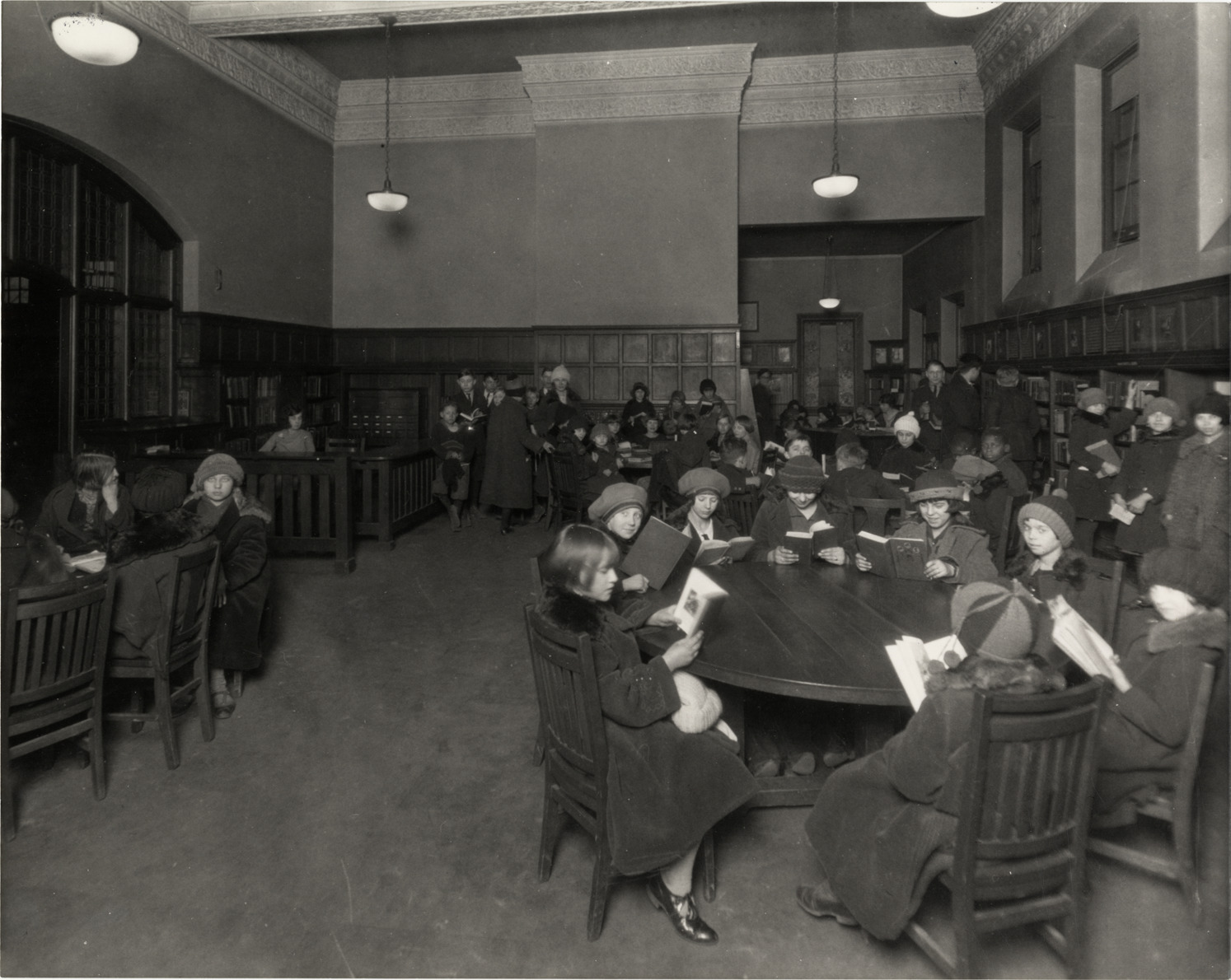View of children reading at tables in the Children's Room of the Butzel Branch Library, Detroit Public Library. Handwritten on back: "Detroit Public Library. Magnus Butzel Branch (no longer a library). 1925. Credit Manning Brothers Historical Archive. Butzel Branch. Interior, Children's Room, 1925."
