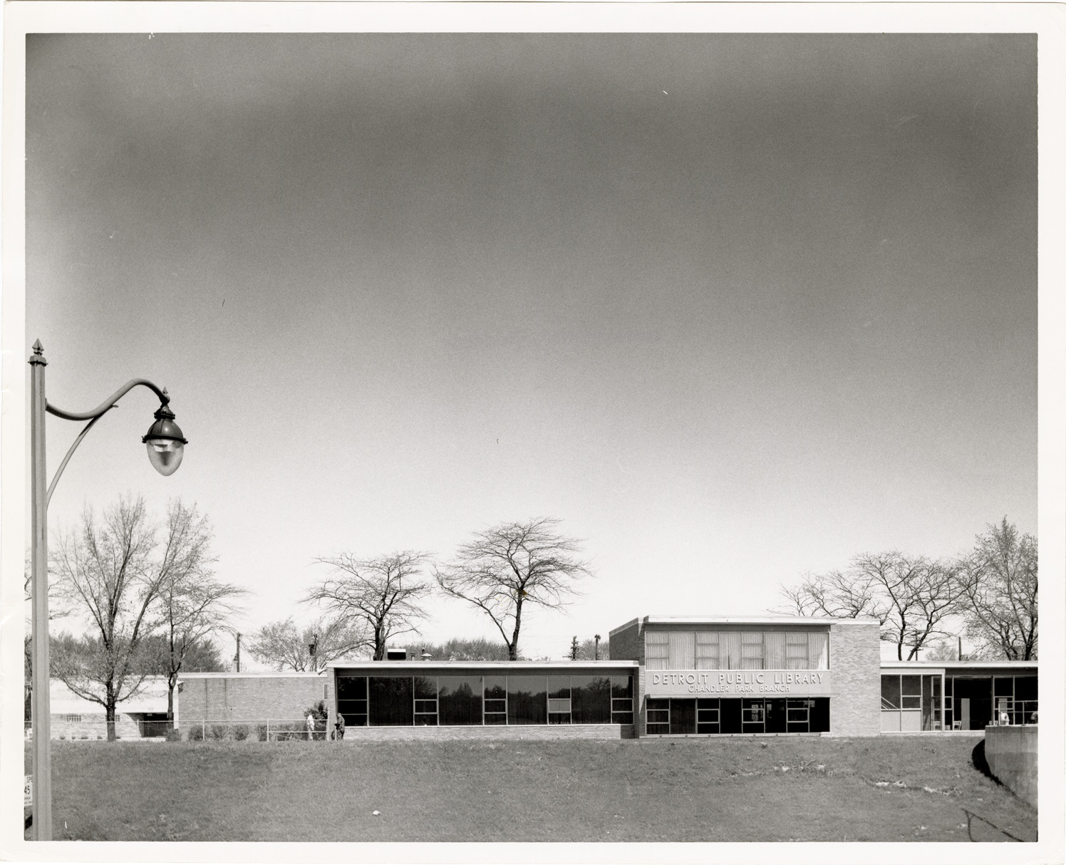 View of the Chandler Park Branch Library, Detroit Public Library. Label on back: "Detroit Public Library. Chandler Park Branch." Handwritten on back: "1967."