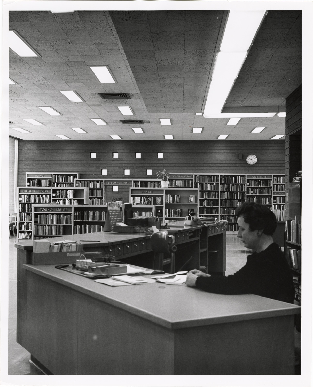 View of librarian at charge desk at the Chandler Park Branch Library, Detroit Public Library. Adult Reading Room in background. Stamped on back: "Michigan Bell Tel. Company Photographic. Jan 29, 1965." Label on back: "Chandler Park Branch. 12800 Harper. Charge desk with view of Adult Reading Room."