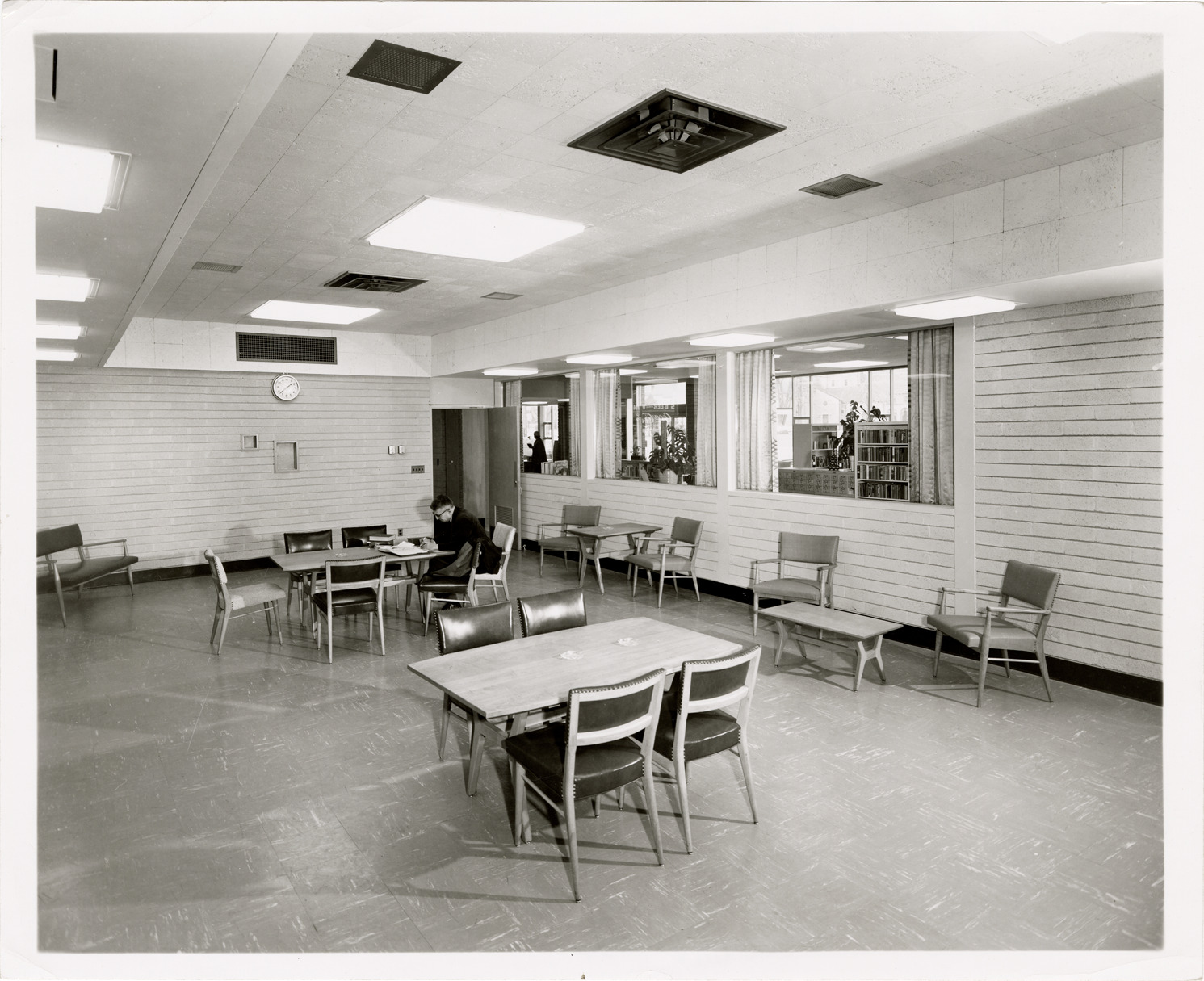View of man reading at table in study room of the Chaney Branch Library, Detroit Public Library. Room is furnished with tables and chairs. Stamped on back: "Ange Baune photography. 5533 Woodward Ave. Te. 2-2011. Detroit 2, Mich." Handwritten on back: "December, 1955."