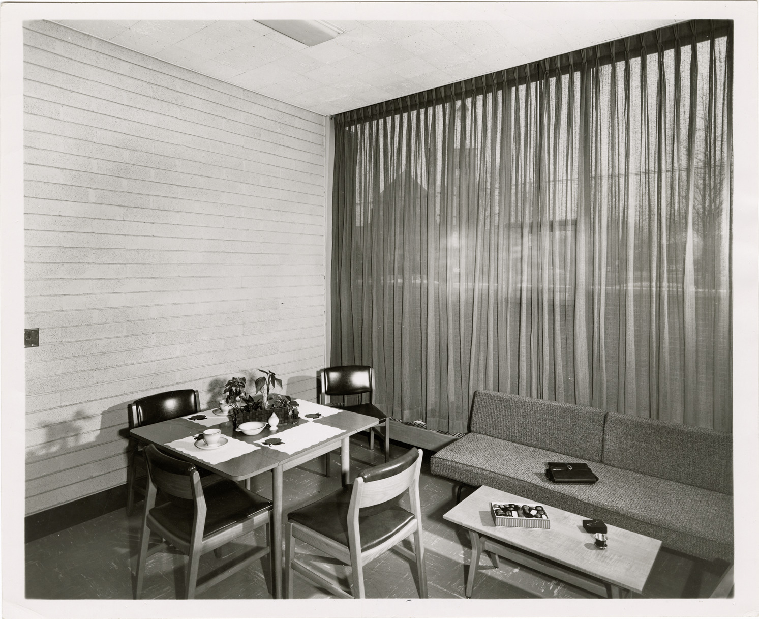 View of a meeting room in the Chaney Branch Library, Detroit Public Library. Room is furnished with tables, chairs, sofa and end table. Box of candy on table. Stamped on back: "Ange Baune photography. 5533 Woodward Ave. Te. 2-2011. Detroit 2, Mich." Handwritten on back: "December, 1955."