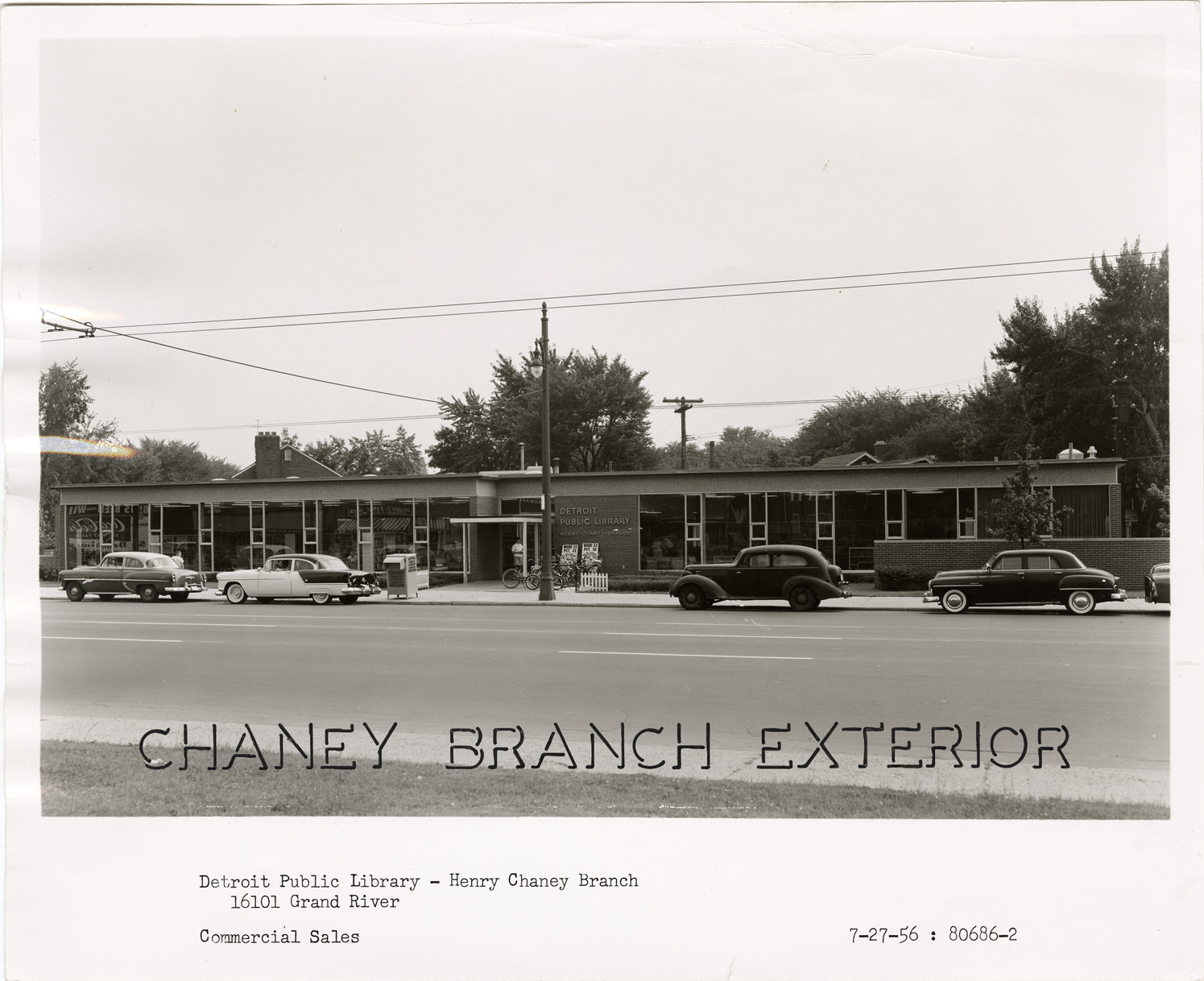 Favorite this☆ Chaney Branch Library Description: View of cars parked in front of the Chaney Branch Library, Detroit Public Library. Printed on front: "Chaney Branch exterior. Detroit Public Library - Henry Chaney Branch. 16101 Grand River. Commercial Sales. 7-27-56: 80686-2." Details Resource ID: bh018927 Subject: Detroit Public Library. Chaney Branch Library buildings--Michigan--Detroit Branch libraries--Michigan--Detroit Public libraries--Michigan--Detroit Automobiles--Michigan--Detroit Photographic prints Date Issued: 1956-07-27 Format: 1 photographic print ; 8 x 10 in. Member of: Burton Historical Collection Filing Location: D/Libraries-DPL-Branches-Chaney Rights: Physical rights are retained by DPL. Copyright is retained in accordance with U.S. copyright laws.
